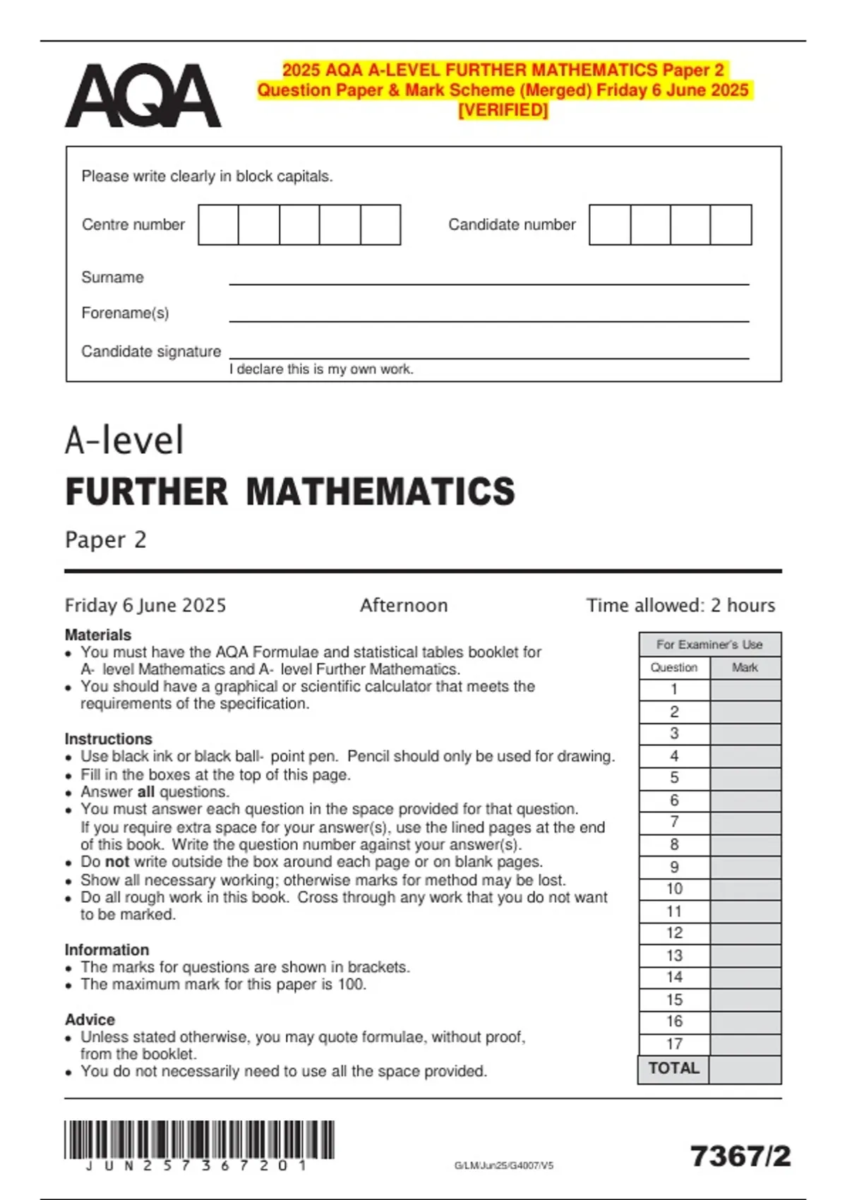 Friday 6 June 2025 Afternoon Time allowed: 2 hours