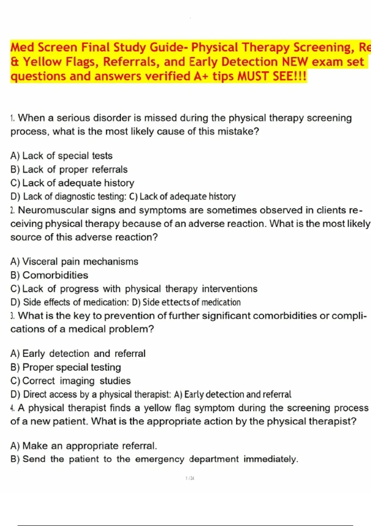 Med Screen Final Study Guide- Physical Therapy Screening, Red & Yellow Flags, Referrals, and Early Detection NEW exam set questions and answers verified A+ tips MUST SEE!!!.pdf Med Screen Final Study Guide- Physical Therapy Screening, Red & Yellow Flags, Referrals, and Early Detection NEW exam set questions and answers verified A+ tips MUST SEE!!!.pdf Med Screen Final Study Guide- Physical Therapy Screening, Red & Yellow Flags, Referrals, and Early Detection NEW exam set questions and answers verified A+ tips MUST SEE!!!.pdf