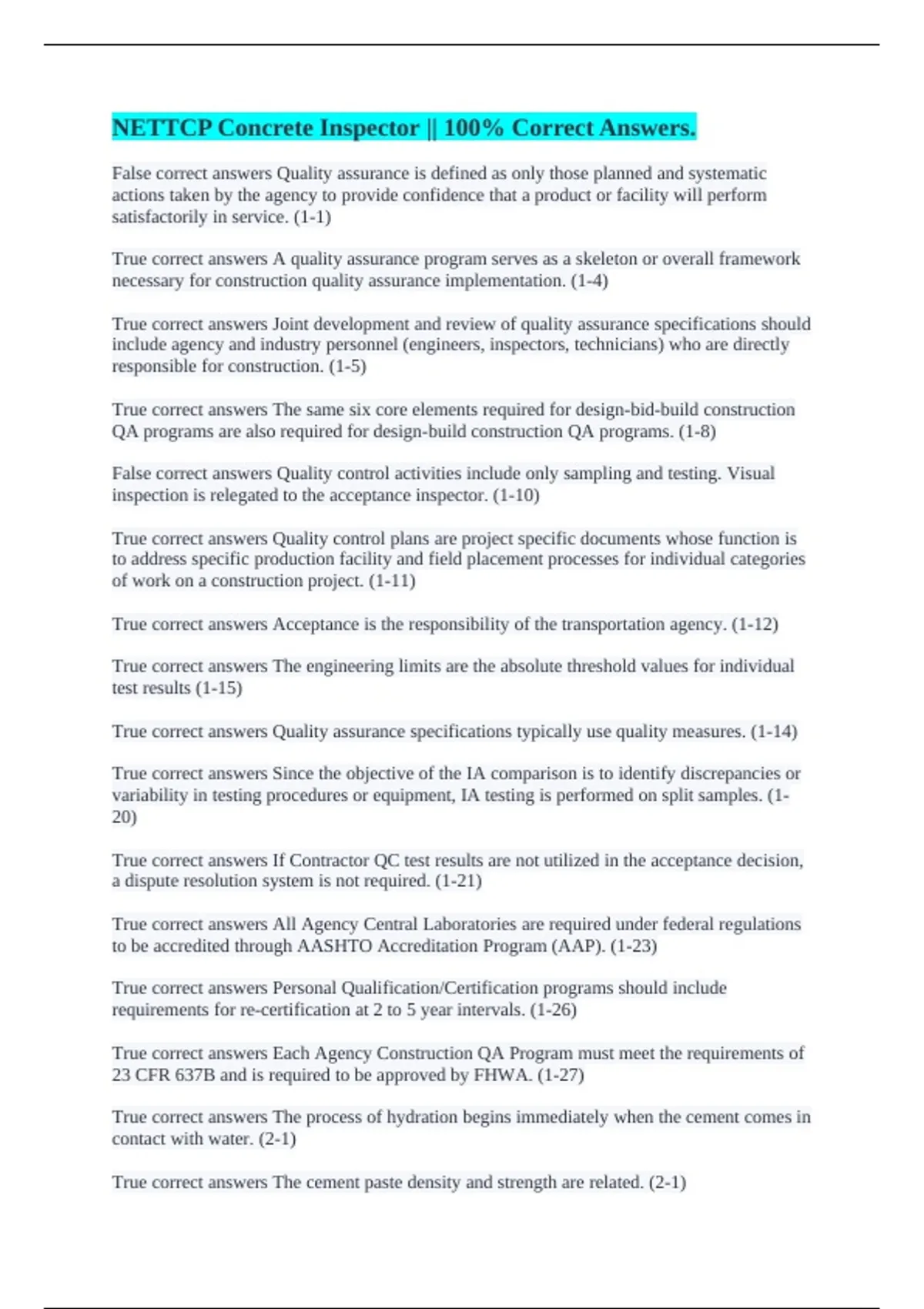 True correct answers Quality assurance specifications typically use quality measures. (1-14)