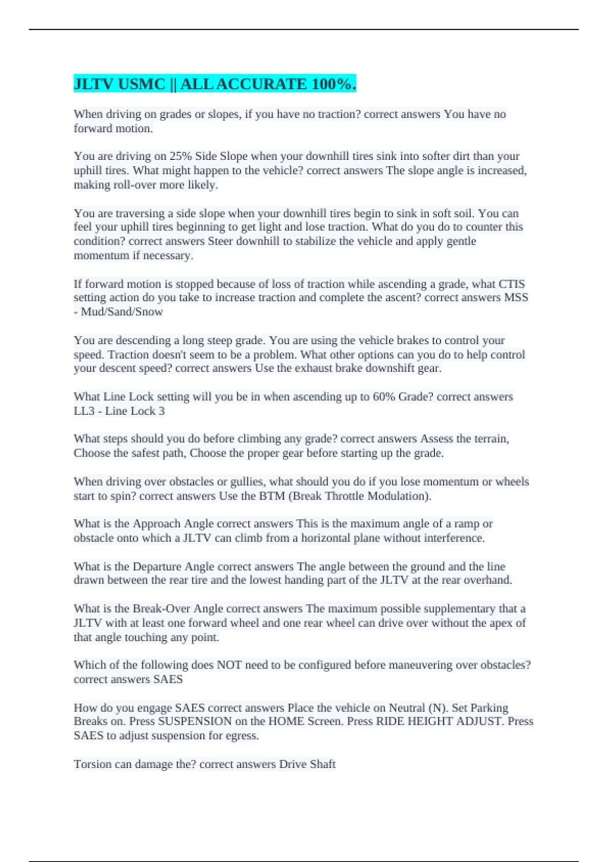 CTIS set to Cross Country, what line lock is the JLTV automatically in? correct answers LL