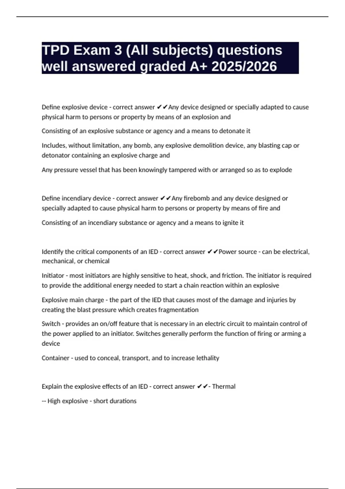 Define explosive device - correct answer ✔✔Any device designed or specially adapted to cause