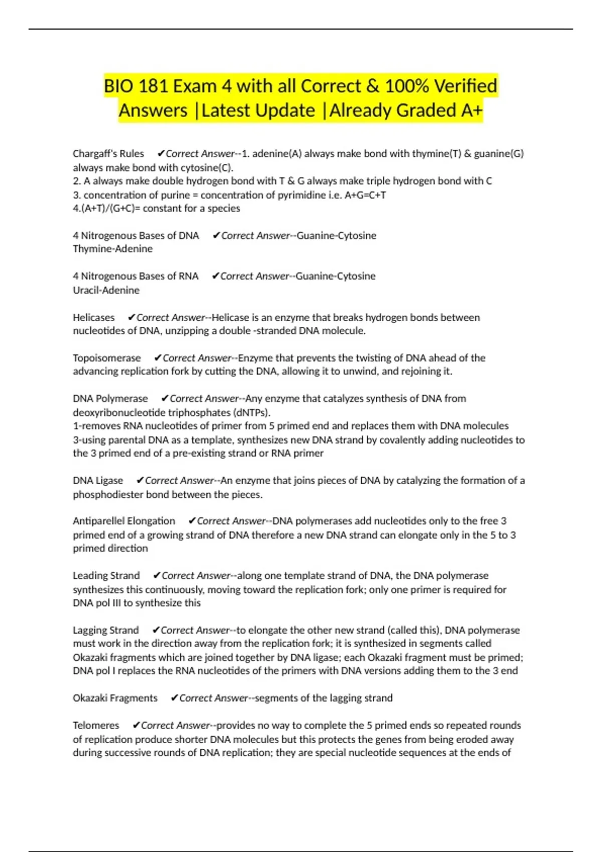 DNA Polymerase ✔Correct Answer--Any enzyme that catalyzes synthesis of DNA from