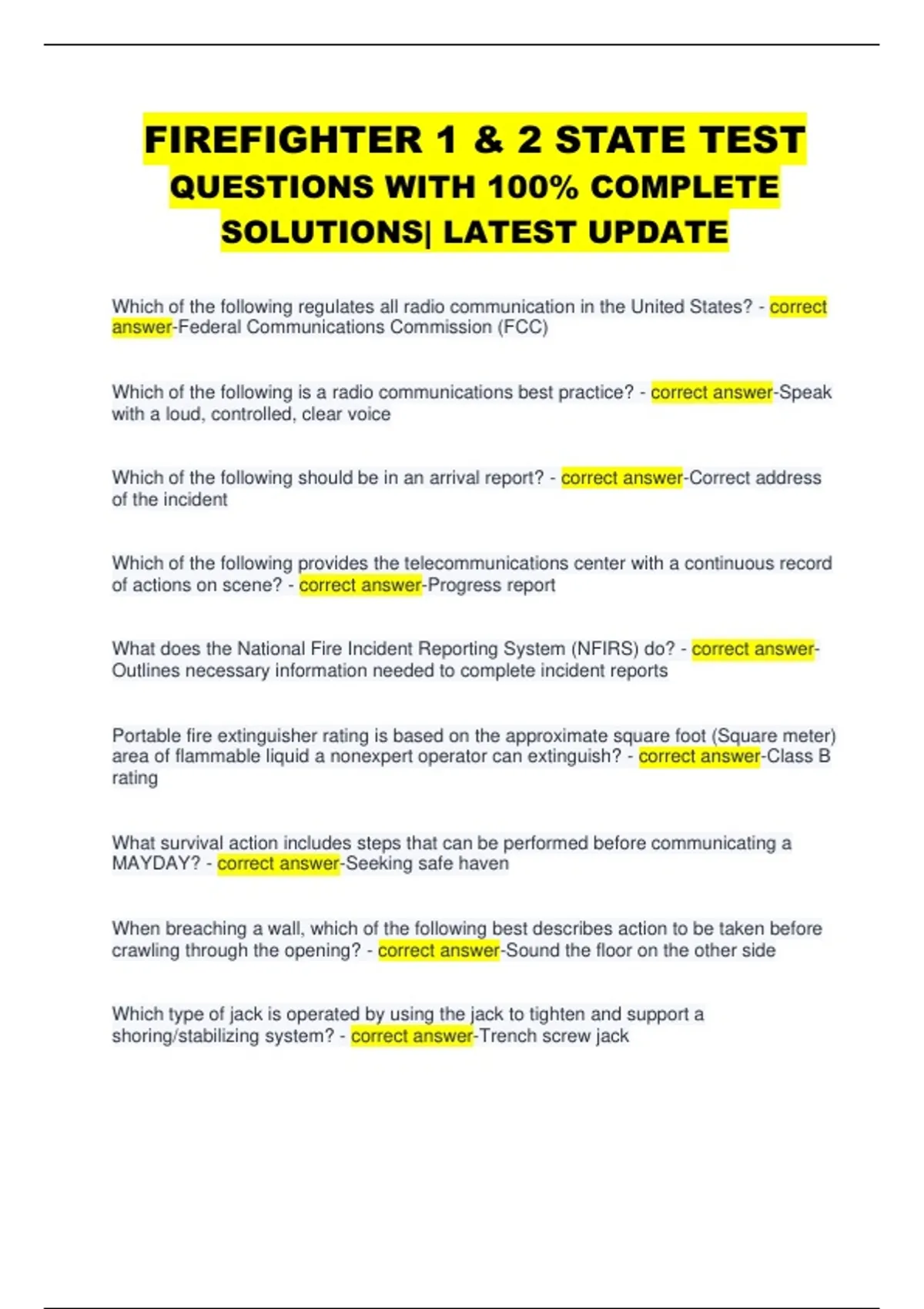 FIREFIGHTER 1 & 2 STATE TEST QUESTIONS WITH 100% COMPLETE SOLUTIONS| LATEST UPDATE