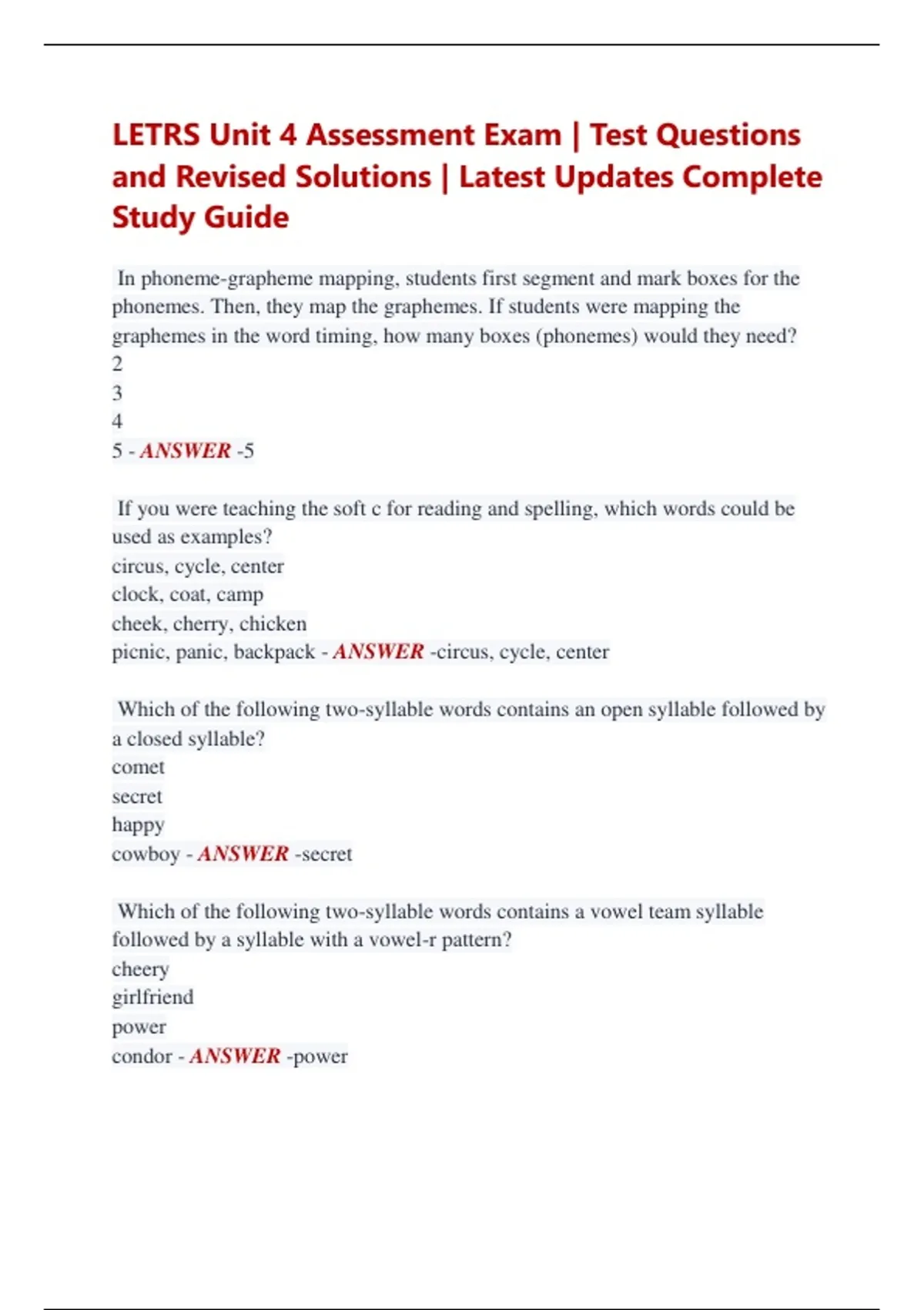 LETRS Unit 4 Assessment Exam | Test Questions and Revised Solutions | Latest Updates Complete Study Guide In phoneme-grapheme mapping, students first segment and mark boxes for the phonemes. Then, they map the graphemes. If students were mapping the graphemes in the word timing, how many boxes (phonemes) would they need? 2 3 4 5 - ANSWER -5 If you were teaching the soft c for reading and spelling, which words could be used as examples? circus, cycle, center clock, coat, camp cheek, cherry, chicken picnic, panic, backpack - ANSWER -circus, cycle, center Which of the following two-syllable words contains an open syllable followed by a closed syllable? comet secret happy cowboy - ANSWER -secret Which of the following two-syllable words contains a vowel team syllable followed by a syllable with a vowel-r pattern? cheery girlfriend power condor - ANSWER -power If a third-grade student writes, "My new puppy is very plafull," what does his misspelling of the word playful most likely indicate? He has not identified the phonemes in the word. He needs a good review of basic letter-sound correspondences. He needs to learn to think about the morphemes, or meaningful parts, in longer words. He needs more review of open and closed syllable combinations. - ANSWER -He needs to learn to think about the morphemes, or meaningful parts, in longer words. Which word might be found in a lesson on adverb (adverbial) suffixes? happy happiness happier happily - ANSWER -happily What is the best explanation for the spelling of smiled during a lesson on rules for adding suffixes to base words? Words ending in silent e drop the e when a vowel suffix is added. When adding -ed to a word ending in silent e, just add d. Since two e's can't go together, drop one when adding -ed. There is no principle or rule to explain this; every word must be learned separately. - ANSWER -Words ending in silent e drop the e when a vowel suffix is added. What is the best definition for oral reading fluency? -reading that is above the 60th percentile in words correct per minute -reading with accuracy, expression, and sufficient speed to support comprehension -reading with at least 90 percent comprehension and 95 percent accuracy, regardless of the rate -close reading intended to extract main ideas and details - ANSWER -reading with accuracy, expression, and sufficient speed to support comprehension What is the most critical step in the process of teaching students to recognize printed words automatically, with little effort? -Collect unknown words, outline them, and post on a word wall. -Emphasize the importance of context cues from the outset. -Make sure each student has a partner to practice sight word reading on cards. -Ensure that students can apply their knowledge of phonics patterns to unknown words. - ANSWER --Ensure that students can apply their knowledge of phonics patterns to unknown words. At what point in a student's reading development do you no longer need to spend any instructional time on systematic, explicit instruction in phonology, phonics, and syllabification? -when students can tell you a sound for each letter in the alphabet -when students can rapidly and accurately read a wide variety of multisyllabic words both in isolation and in a text -when students, after several rereadings, can read a passage and understand it -when students can express themselves with phonetic spelling - ANSWER --when students can rapidly and accurately read a wide variety of multisyllabic words both in isolation and in a text Based on the grapheme representing /sh/, which word is probably from French? machine sugar wash mission - ANSWER -machine Which of the following words is most probably from the Anglo-Saxon layer of English? chorus playground section unique - ANSWER -playground Because of arbitrary and historical conventions governing English orthography, some letters can never be used to end a word. Which word can be explained by that principle? lon