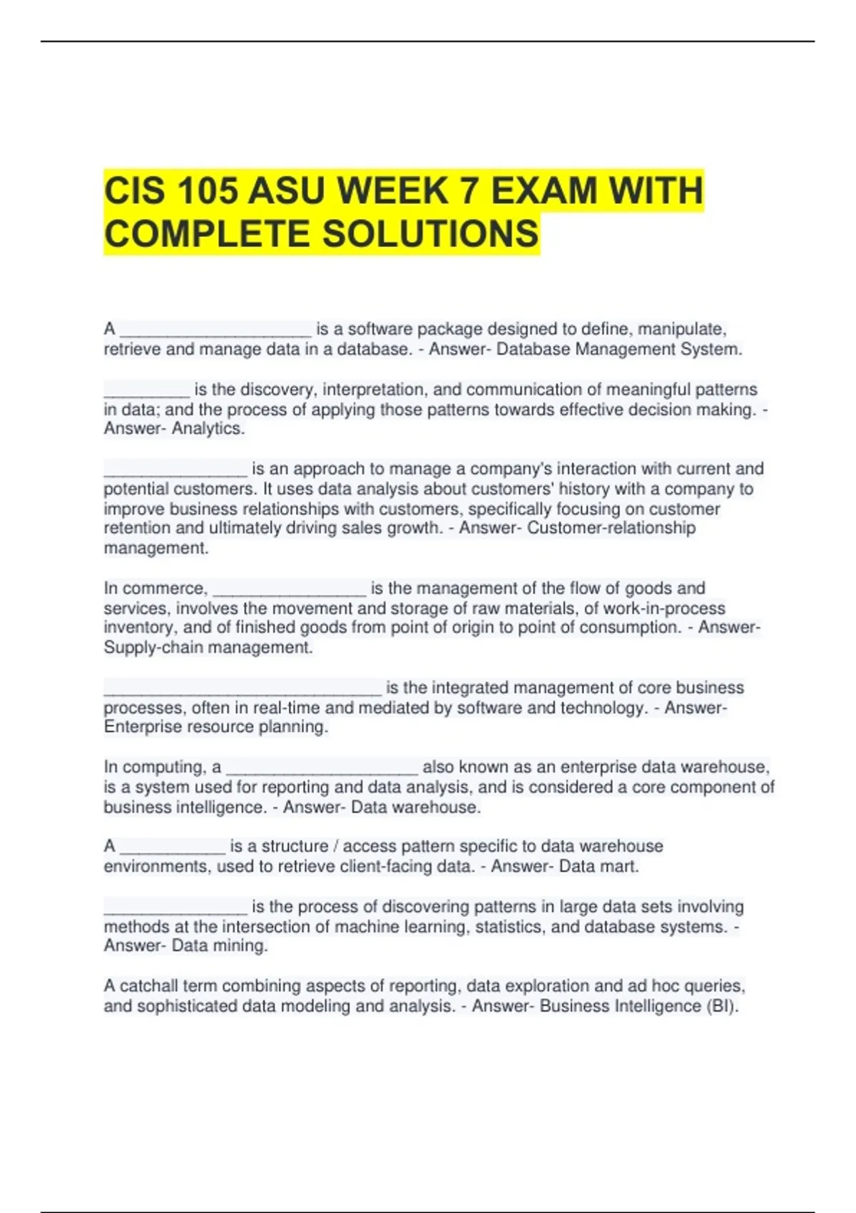 business intelligence. - Answer- Data warehouse.