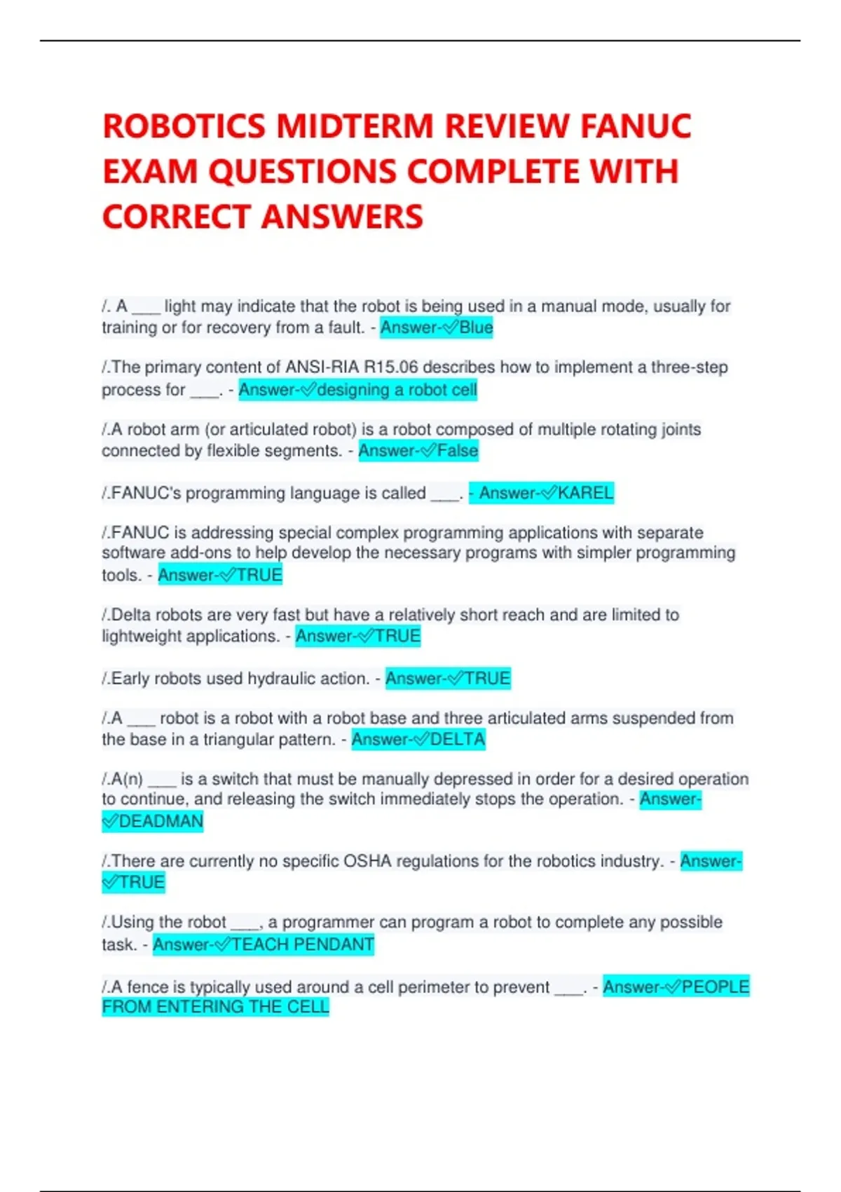 ROBOTICS MIDTERM REVIEW FANUC EXAM QUESTIONS COMPLETE WITH CORRECT ANSWERS /. A ___ light may indicate that the robot is being used in a manual mode, usually for training or for recovery from a fault. - Answer-Blue /.The primary content of ANSI-RIA R15.06 describes how to implement a three-step process for ___. - Answer-designing a robot cell /.A robot arm (or articulated robot) is a robot composed of multiple rotating joints connected by flexible segments. - Answer-False /.FANUC's programming language is called ___. - Answer-KAREL /.FANUC is addressing special complex programming applications with separate software add-ons to help develop the necessary programs with simpler programming tools. - Answer-TRUE /.Delta robots are very fast but have a relatively short reach and are limited to lightweight applications. - Answer-TRUE /.Early robots used hydraulic action. - Answer-TRUE /.A ___ robot is a robot with a robot base and three articulated arms suspended from the base in a triangular pattern. - Answer-DELTA /.A(n) ___ is a switch that must be manually depressed in order for a desired operation to continue, and releasing the switch immediately stops the operation. - Answer-DEADMAN /.There are currently no specific OSHA regulations for the robotics industry. - Answer-TRUE /.Using the robot ___, a programmer can program a robot to complete any possible task. - Answer-TEACH PENDANT /.A fence is typically used around a cell perimeter to prevent ___. - Answer-PEOPLE FROM ENTERING THE CELL /.A ___ robot is a robot with articulated arms that are limited to movement in two dimensions. - Answer-SCARA /.Common types of servomotors include grippers, pneumatic pickers, and welders. - Answer-FALSE /.During a risk assessment, tasks are evaluated ___. - Answer-INDIVIDUALLY /.An emergency stop (E-stop) is a condition in which a machine's controls gradually stop all movement. - Answer-False /.A robot ___ is a worker who readies a robot to perform programmed tasks, monitors its operation, and does any manual chores required when the robot completes a production run. - Answer-OPERATOR /.Typical responsibilities of a(n) ___ include general preventive maintenance such as changing batteries, changing oil, greasing, and testing for gear backlash. - Answer-MAINTENANCE TECHNICIAN /.By rebooting the robot when the last production part enters the cell, the cell is primed for startup. - Answer-FALSE /.A programmer needs to understand programming languages, such as Rapid and KAREL, to understand how to program a robot and make it complete a desired task. - Answer-FALSE /.Robots can spot weld, arc weld, assemble, paint, and load, unload, and stack parts. - Answer-TRUE /.All programming tasks are seen to have the same risks. - Answer-TRUE /.Each FANUC robot is identified with an R-number. - Answer-FALSE /.The ___ is the volume of space that is defined by the maximum distance the robot can reach. - Answer-WORK ENVELOPE /.Robot cell operation and recovery procedures are broken into categories including: cell cleaning, cell setup/startup, cell shutdown/runout, and cell ___. - Answer-FAULT REVOVERY /.___ is a federal agency that has the power to enforce compliance with certain regulations and fine private-sector companies and organizations for violations. - Answer-Occupational Safety and Health Administration (OSHA)