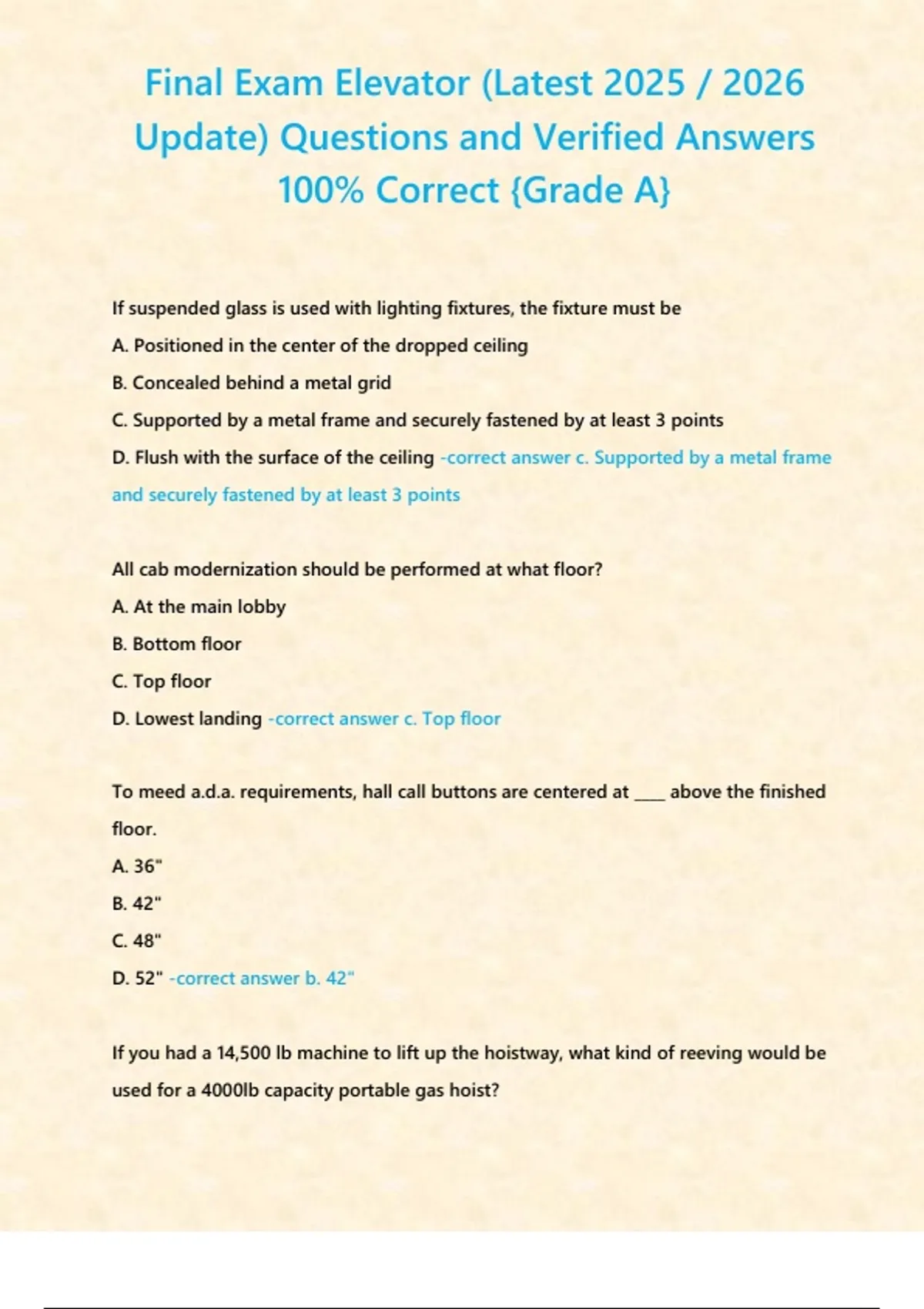 Final Exam Elevator (Latest Update) Questions and Verified Answers 100- Correct -Grade
