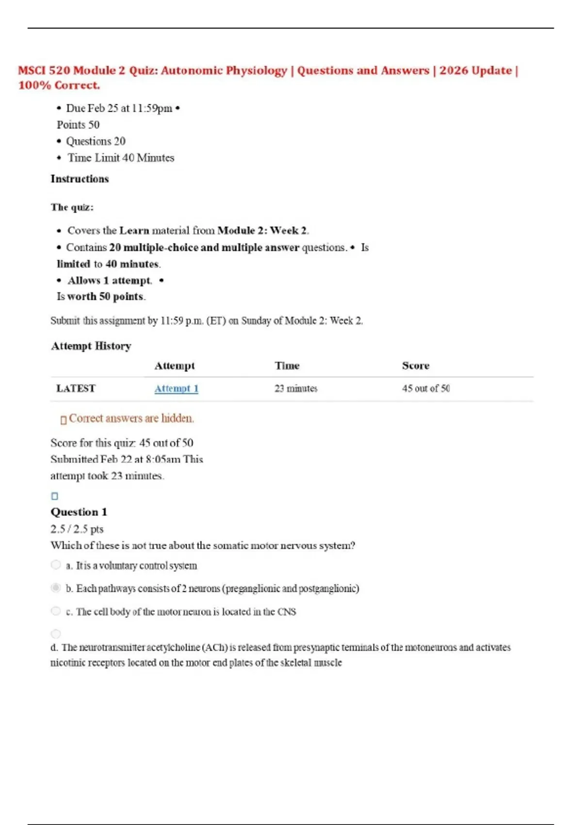 MSCI 520 Module 2 Quiz: Autonomic Physiology | Questions and Answers | 2026 Update | 100% Correct.