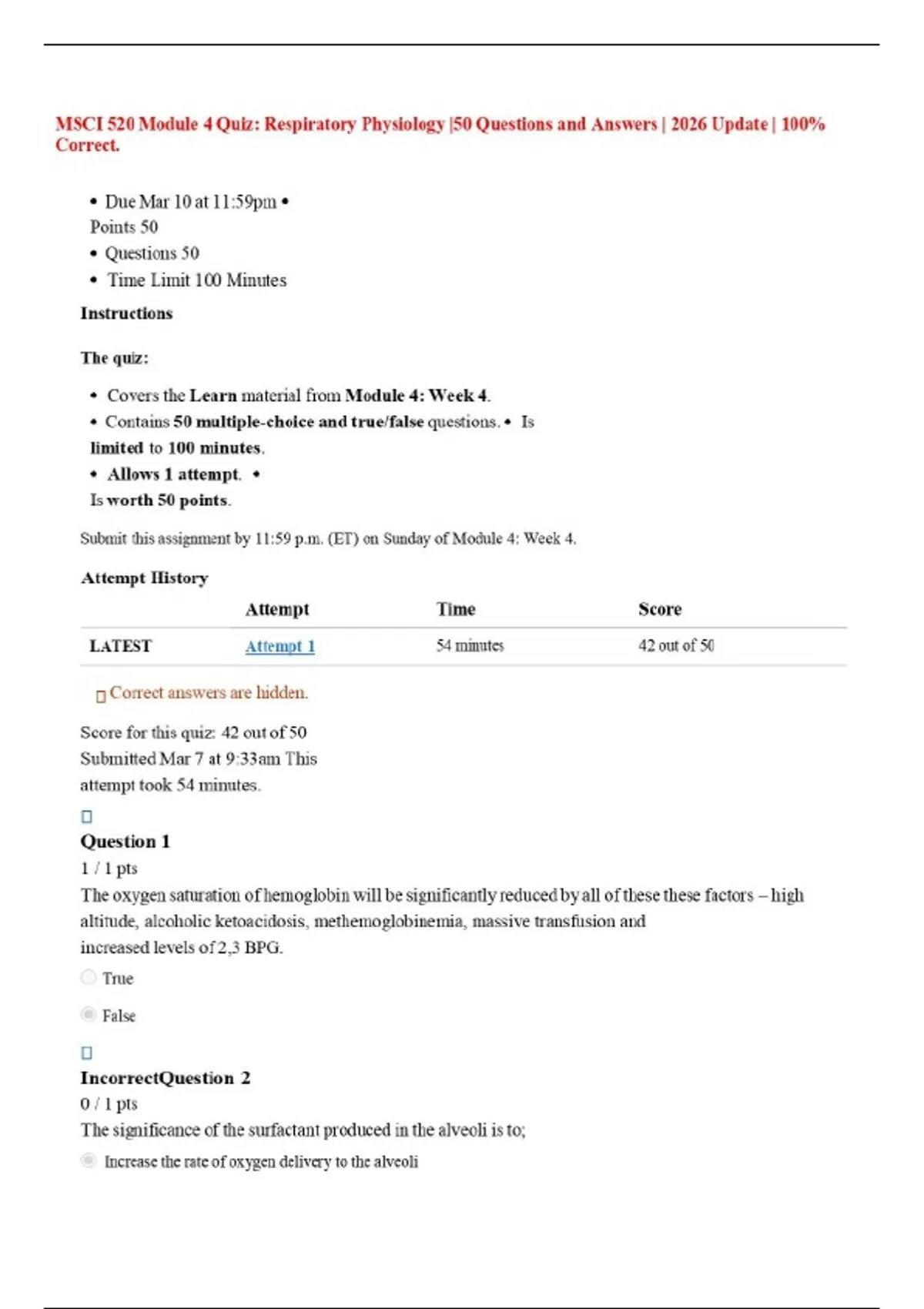 MSCI 520 Module 4 Quiz: Respiratory Physiology |50 Questions and Answers | 2026 Update | 100% Correct.