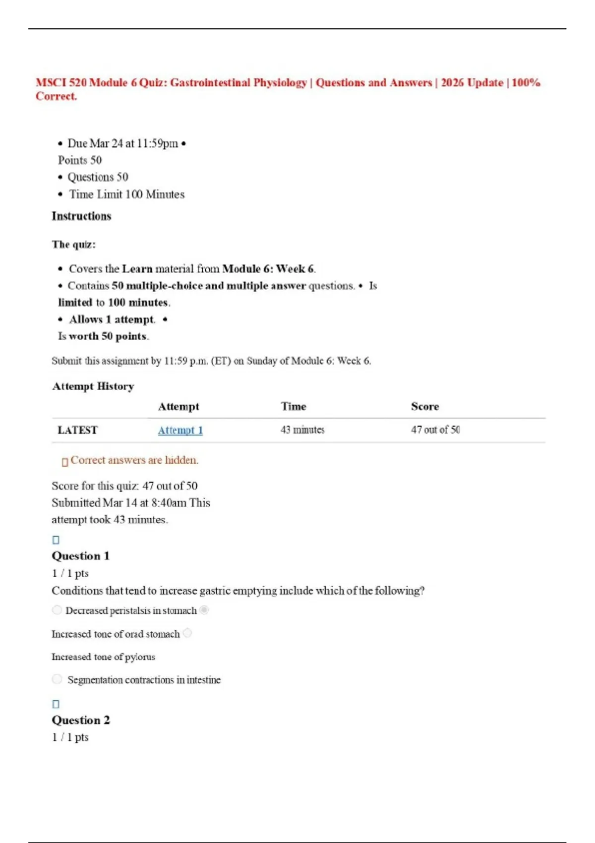 MSCI 520 Module 6 Quiz: Gastrointestinal Physiology | Questions and Answers | 2026 Update | 100% Correct.