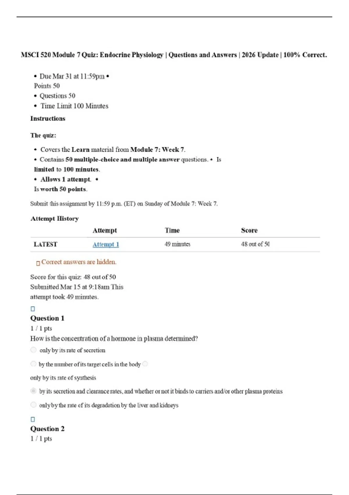 MSCI 520 Module 7 Quiz: Endocrine Physiology | Questions and Answers | 2026 Update | 100% Correct.