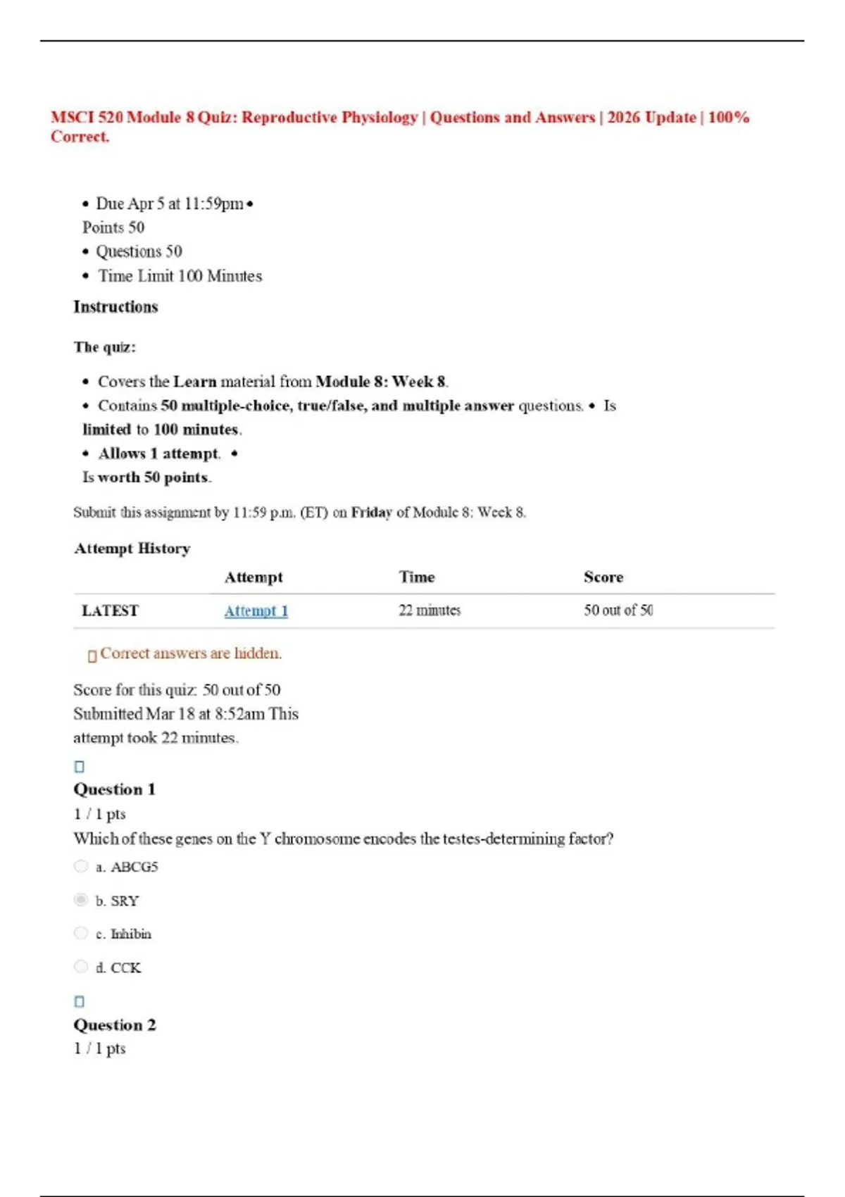 MSCI 520 Module 8 Quiz: Reproductive Physiology | Questions and Answers | 2026 Update | 100% Correct.