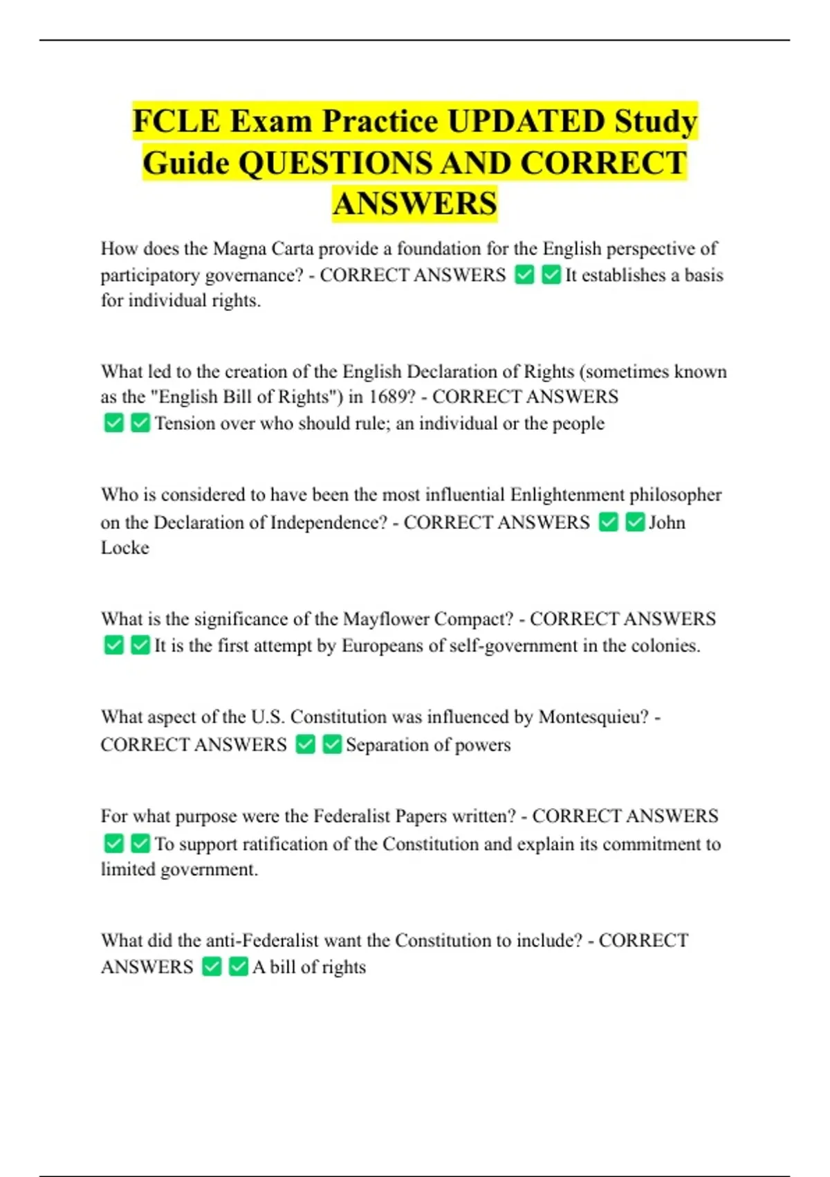 FCLE Exam Practice UPDATED Study Guide QUESTIONS AND CORRECT ANSWERS How does the Magna Carta provide a foundation for the English perspective of participatory governance? - CORRECT ANSWERS It establishes a basis for individual rights.