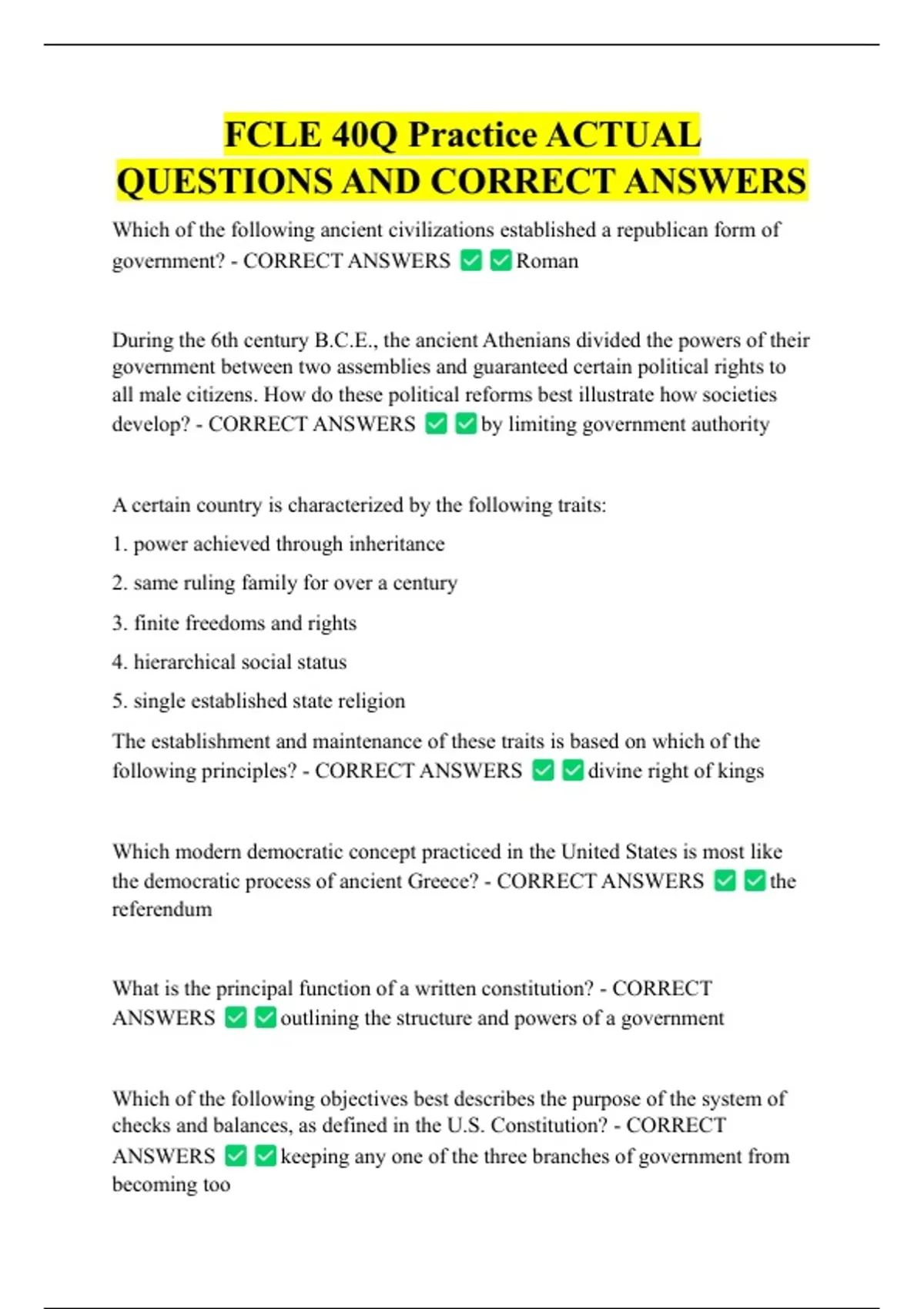 FCLE 40Q Practice ACTUAL QUESTIONS AND CORRECT ANSWERS Which of the following ancient civilizations established a republican form of government? - CORRECT ANSWERS Roman