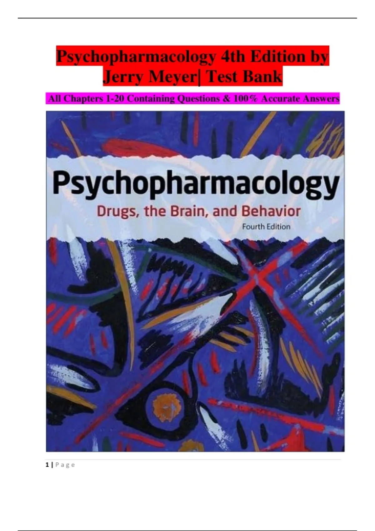 This document contains a comprehensive test bank for Psychopharmacology (4th Edition) by Jerry Meyer, covering all chapters from 1 to 20. It includes exam-style questions with accurate, well-structured answers designed to support exam preparation and mastery of psychopharmacological concepts.