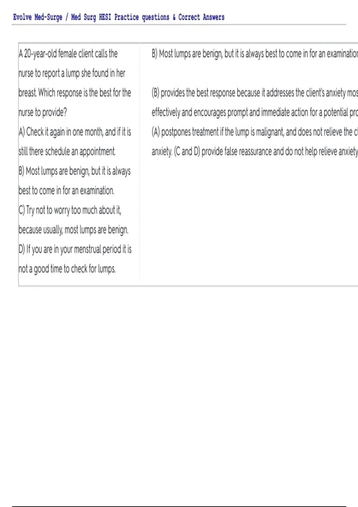 A 20-year-old female client calls the B) Most lumps are benign, but it is always best to come in for an examination