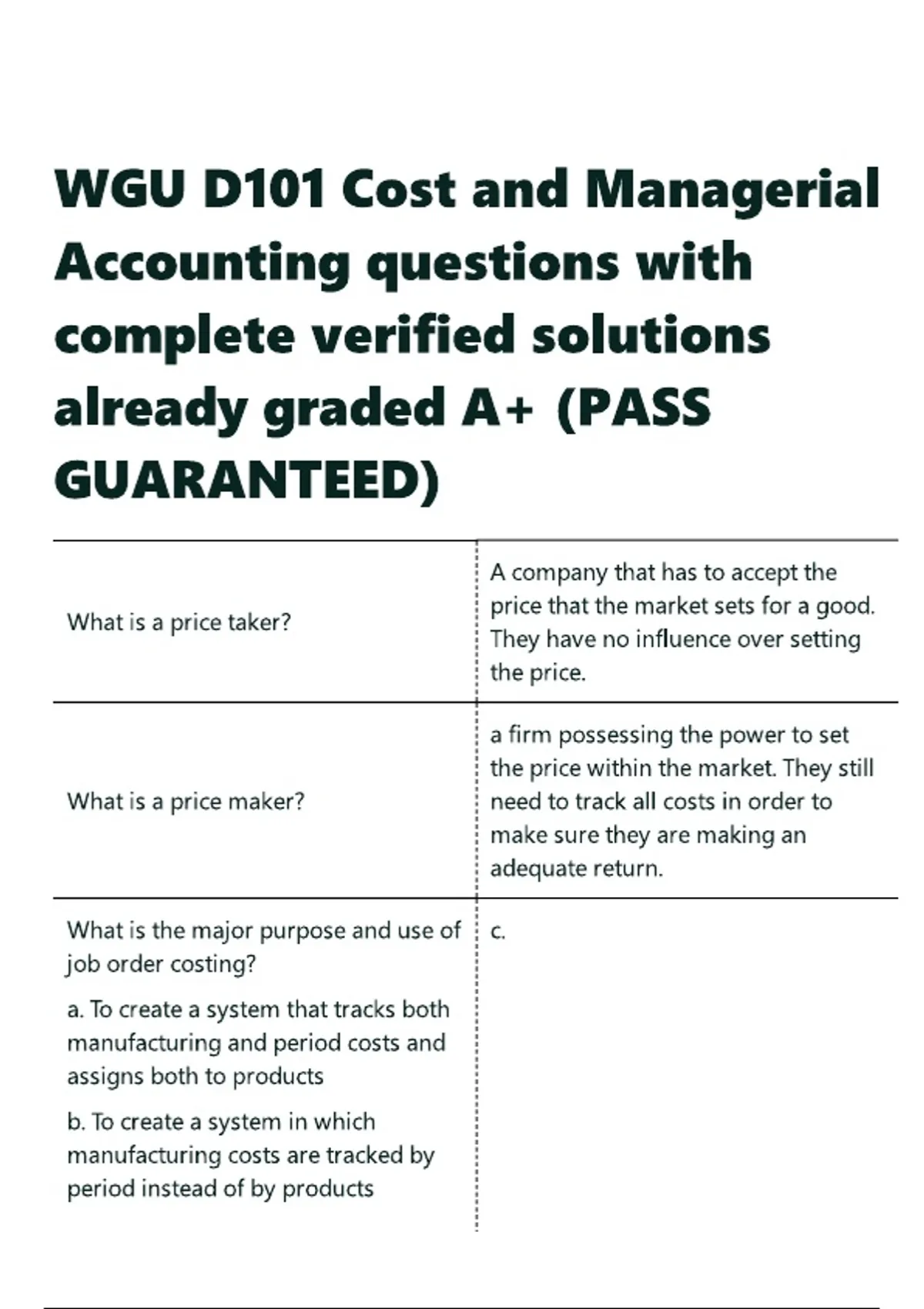 WGU D101 Cost and Managerial Accounting questions with complete verified solutions already graded A+