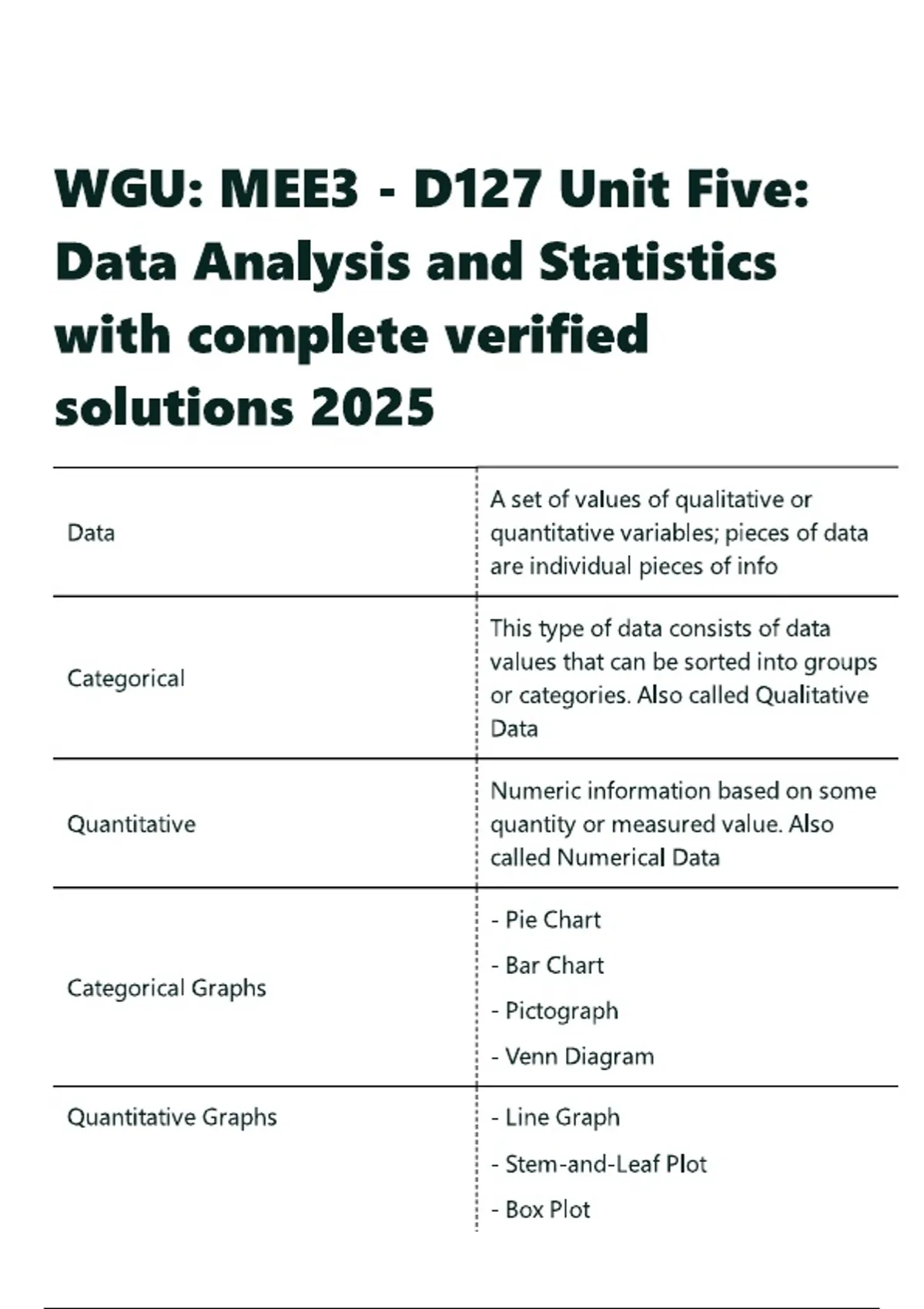 WGU MEE3 - D127 Unit Five Data Analysis and Statistics with complete verified solutions 2025