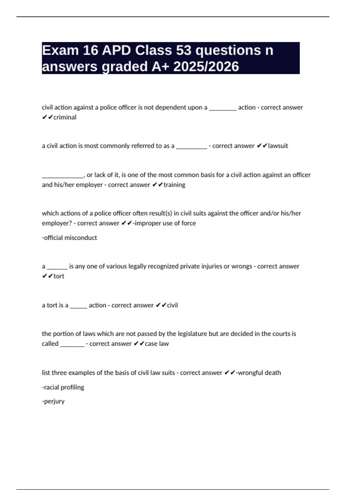a tort is a _____ action - correct answer ✔✔civil
