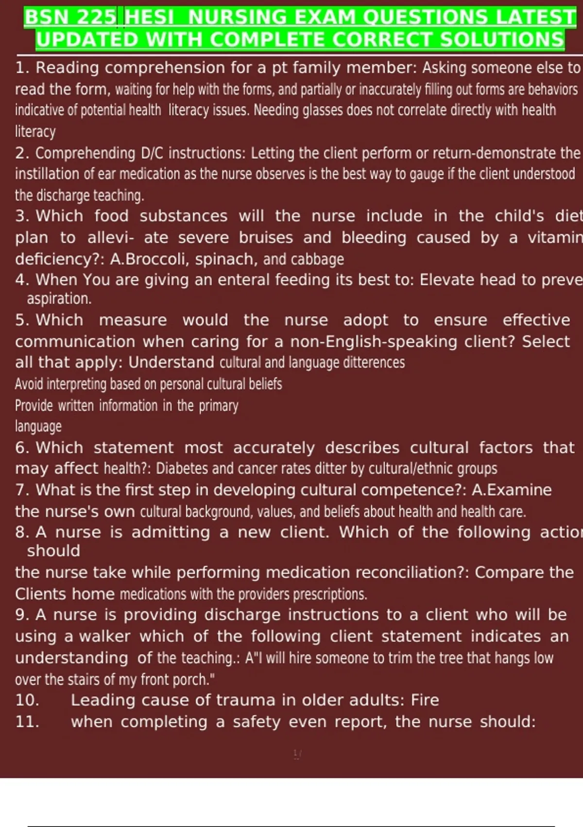 , BSN 225 HESI NURSING EXAM QUESTIONS LATEST