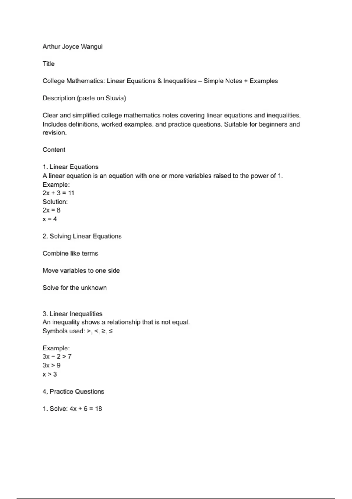 Clear and simplified college mathematics notes covering linear equations and inequalities.