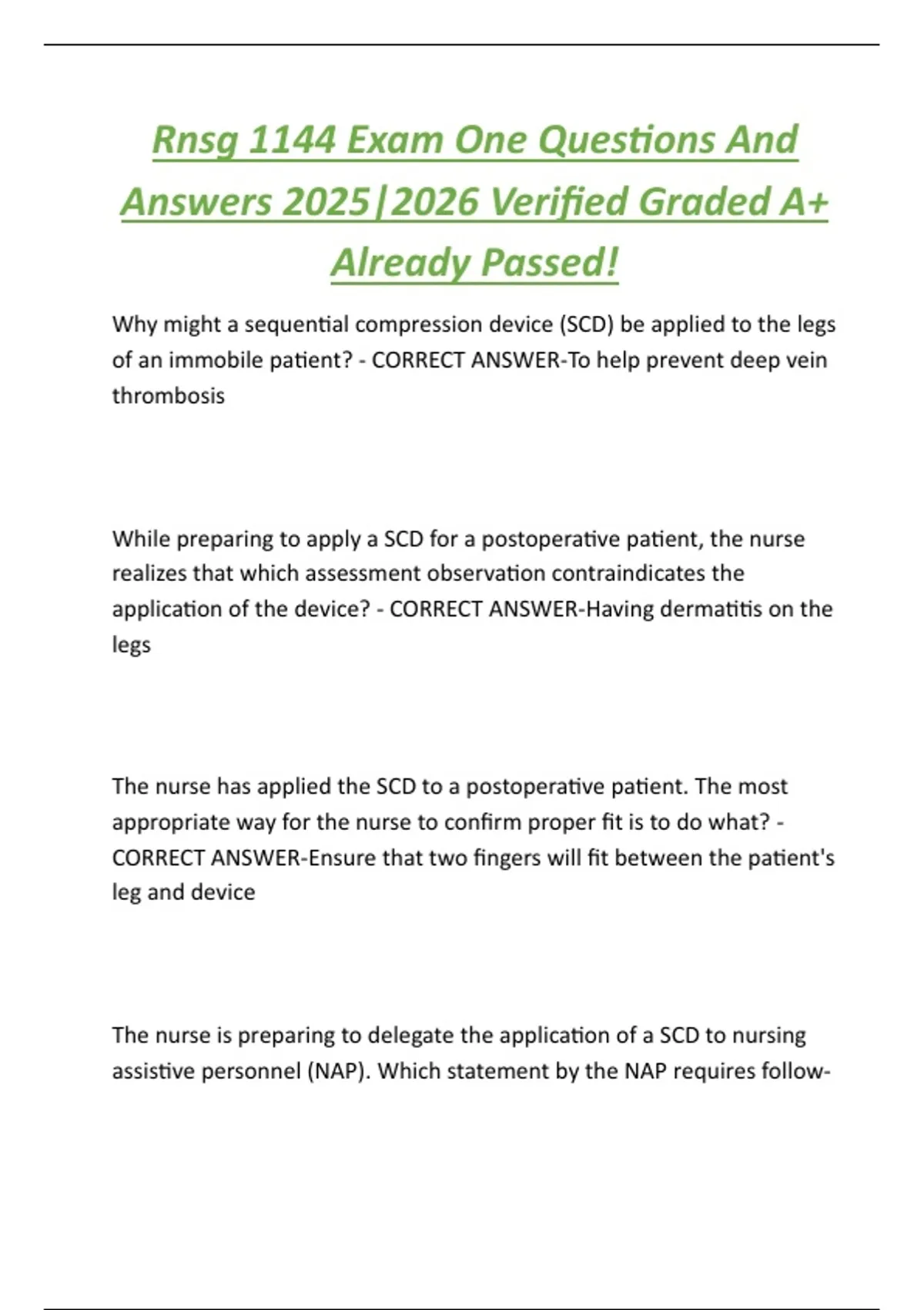 The nurse is preparing to delegate the application of a SCD to nursing