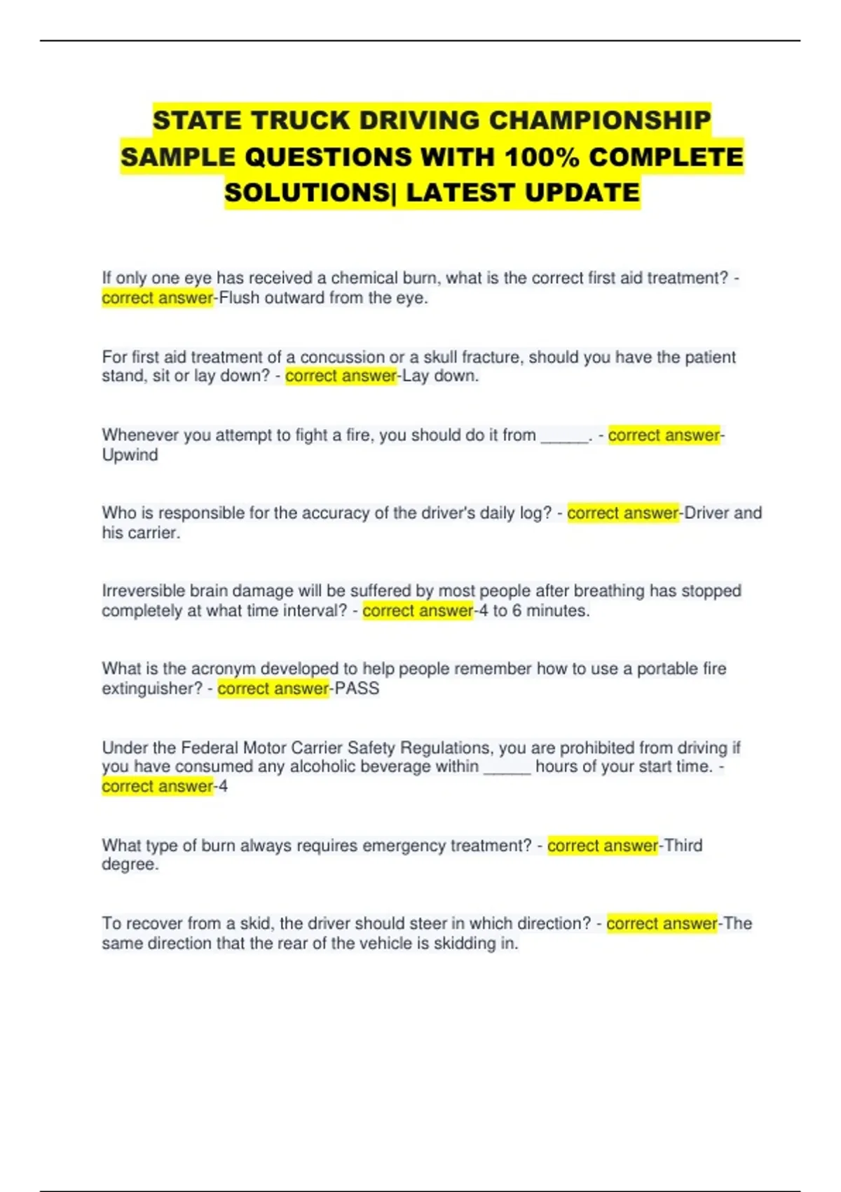 STATE TRUCK DRIVING CHAMPIONSHIP SAMPLE QUESTIONS WITH 100% COMPLETE SOLUTIONS| LATEST UPDATE