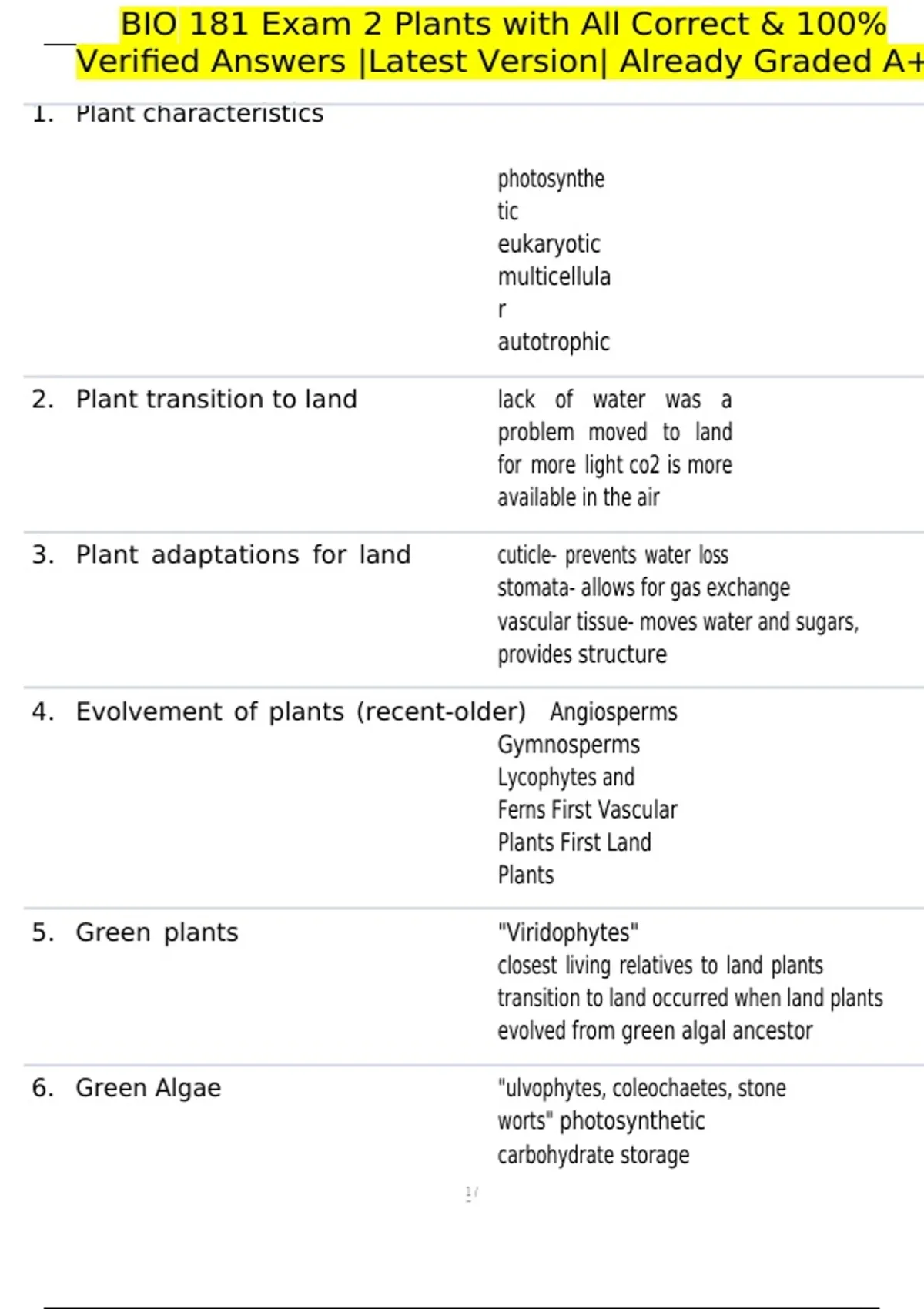 , BIO 181 Exam 2 Plants with All Correct & 100%