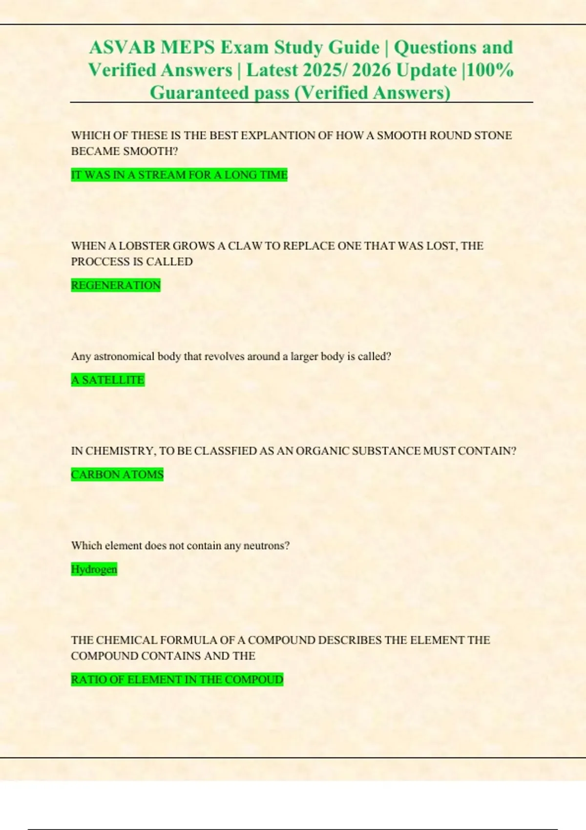This study guide includes a comprehensive collection of ASVAB MEPS exam questions with 100% verified correct answers designed to support effective preparation. It covers all major ASVAB sections such as Arithmetic Reasoning, Mathematics Knowledge, Word Knowledge, Paragraph Comprehension, and technical subtests, making it suitable for the latest 2025–2026 exam standards and confidence-based review.