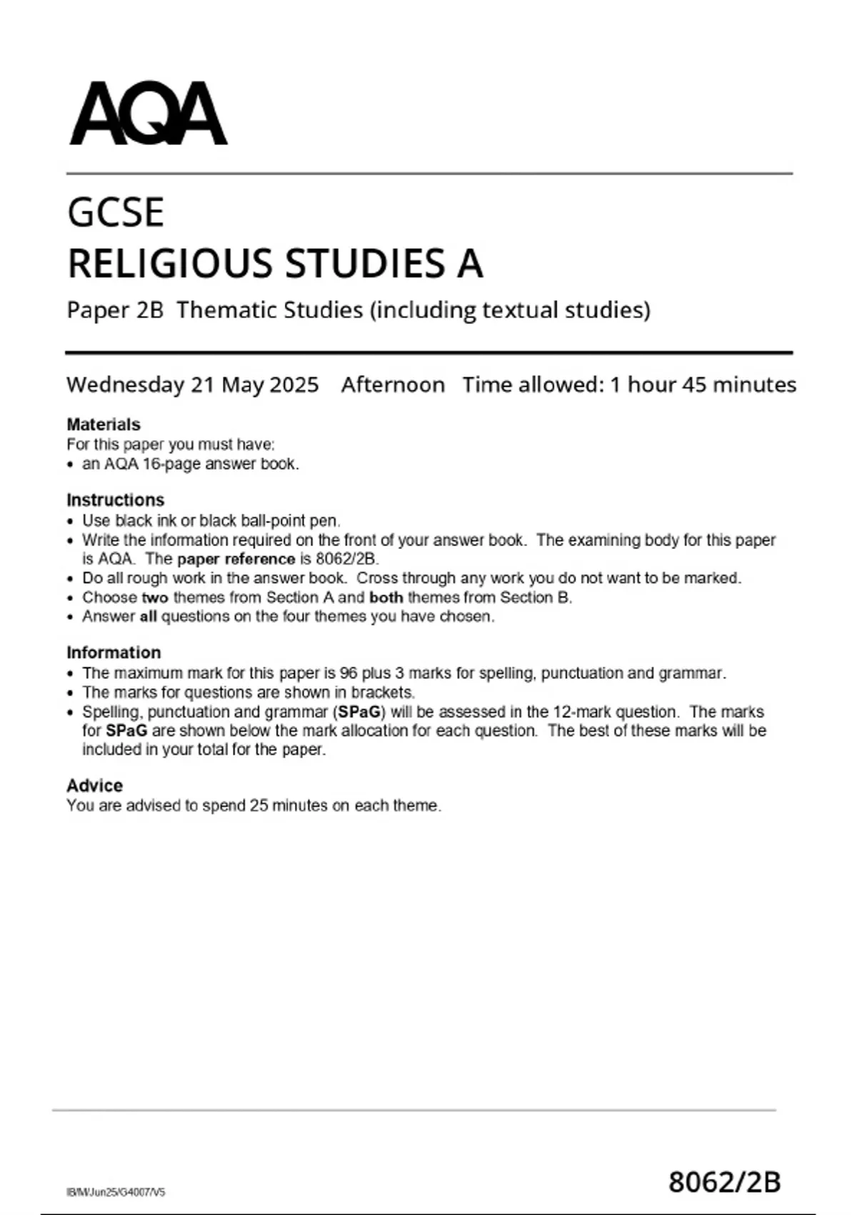 - 2025 ACTUAL AQA GCSE RELIGIOUS STUDIES A 8062/2B