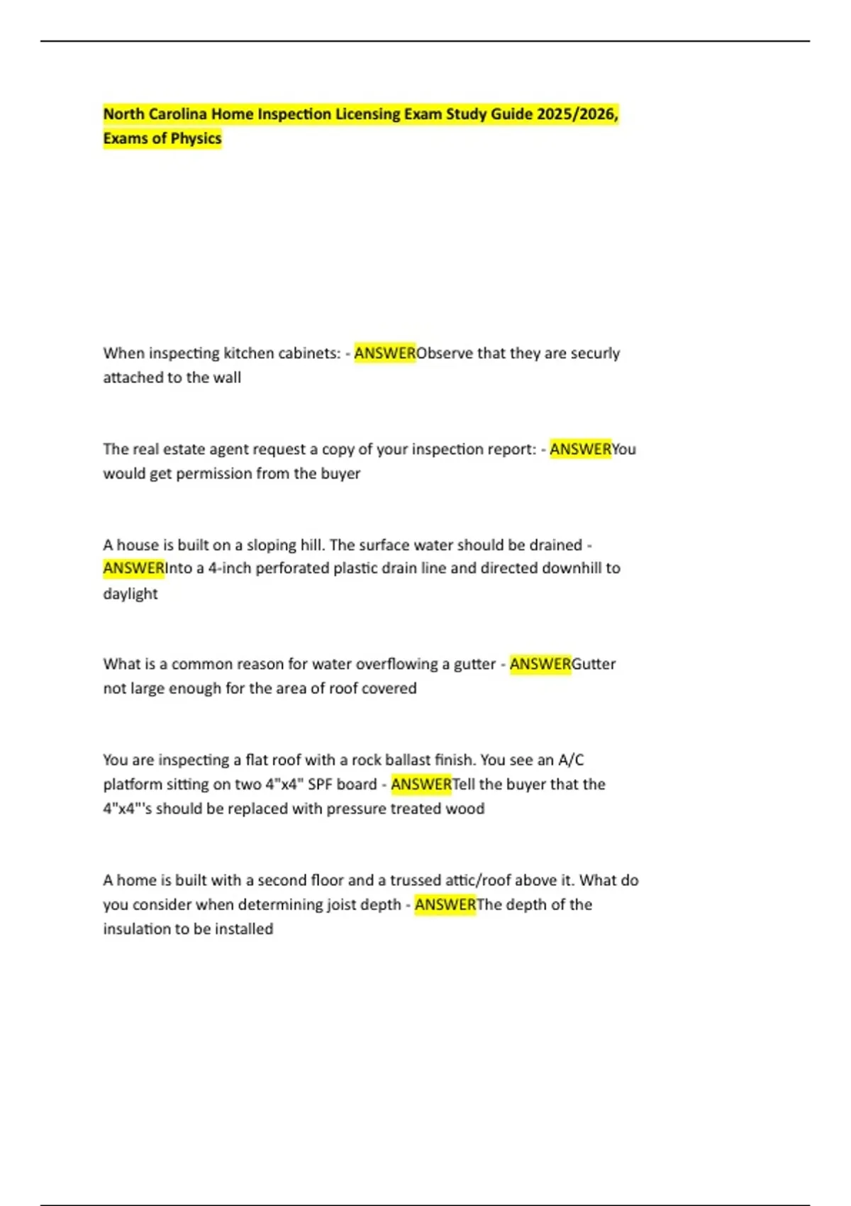 North Carolina Home Inspection Licensing Exam Study Guide 2025/2026, Exams of Physics