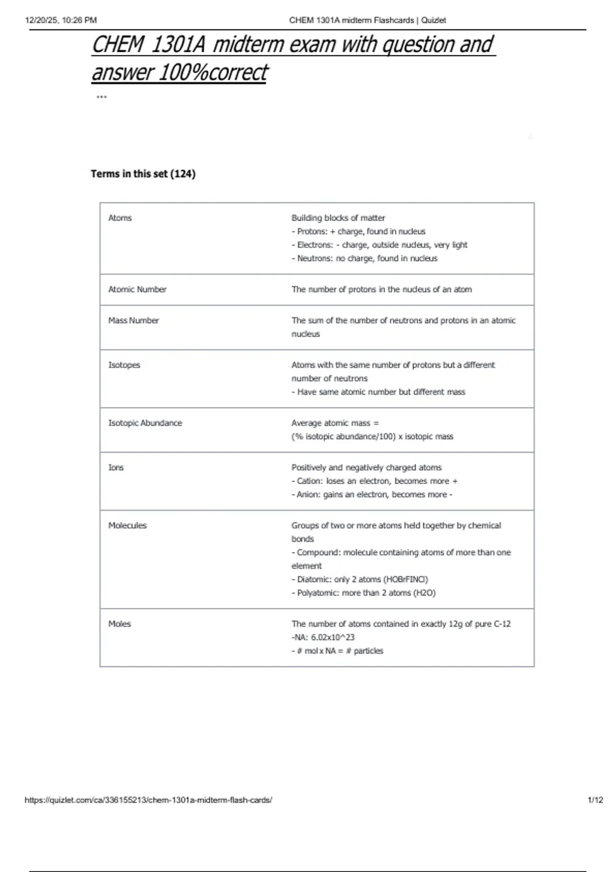 12/20/25, 10:26 PM CHEM 1301A midterm Flashcards | Quizlet