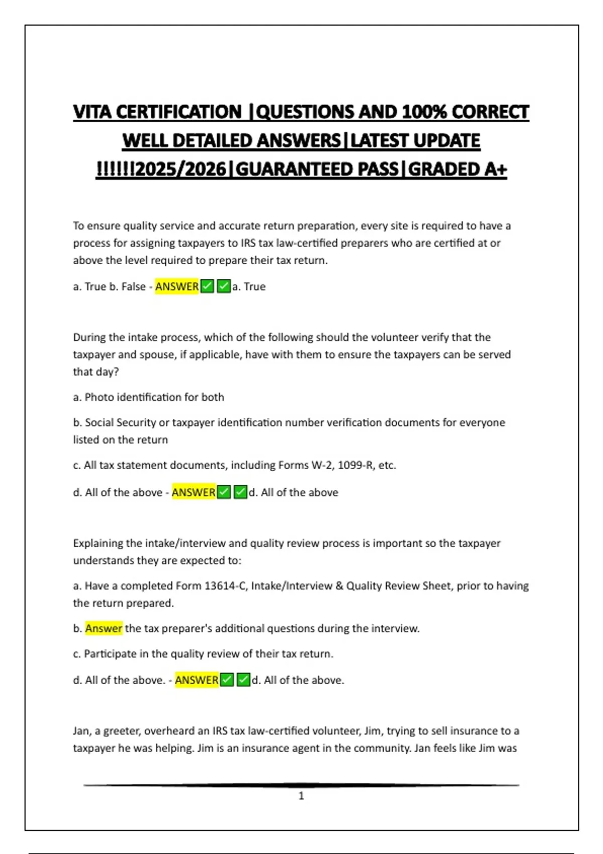 VITA CERTIFICATION |QUESTIONS AND 100% CORRECT WELL DETAILED ANSWERS|LATEST UPDATE !!!!!!2025/2026|GUARANTEED PASS|GRADED A+