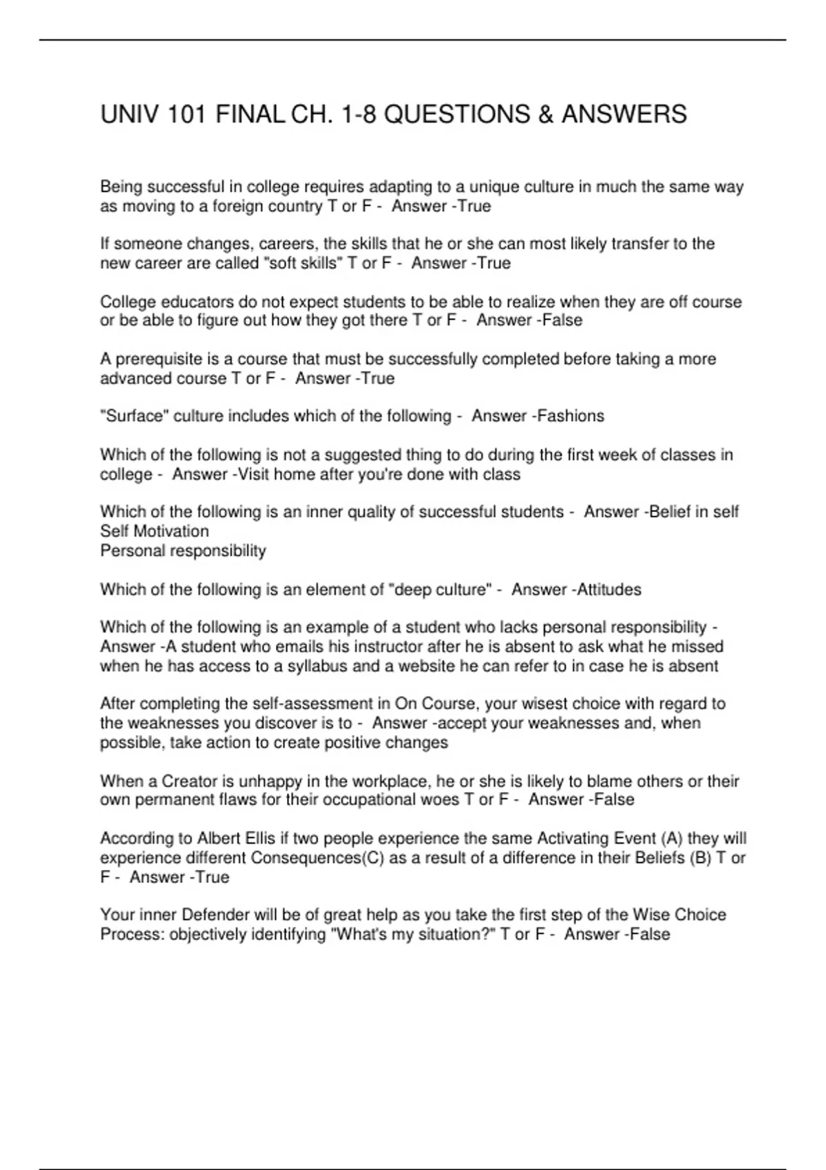 UNIV 101 FINAL CH. 1-8 QUESTIONS & ANSWERS