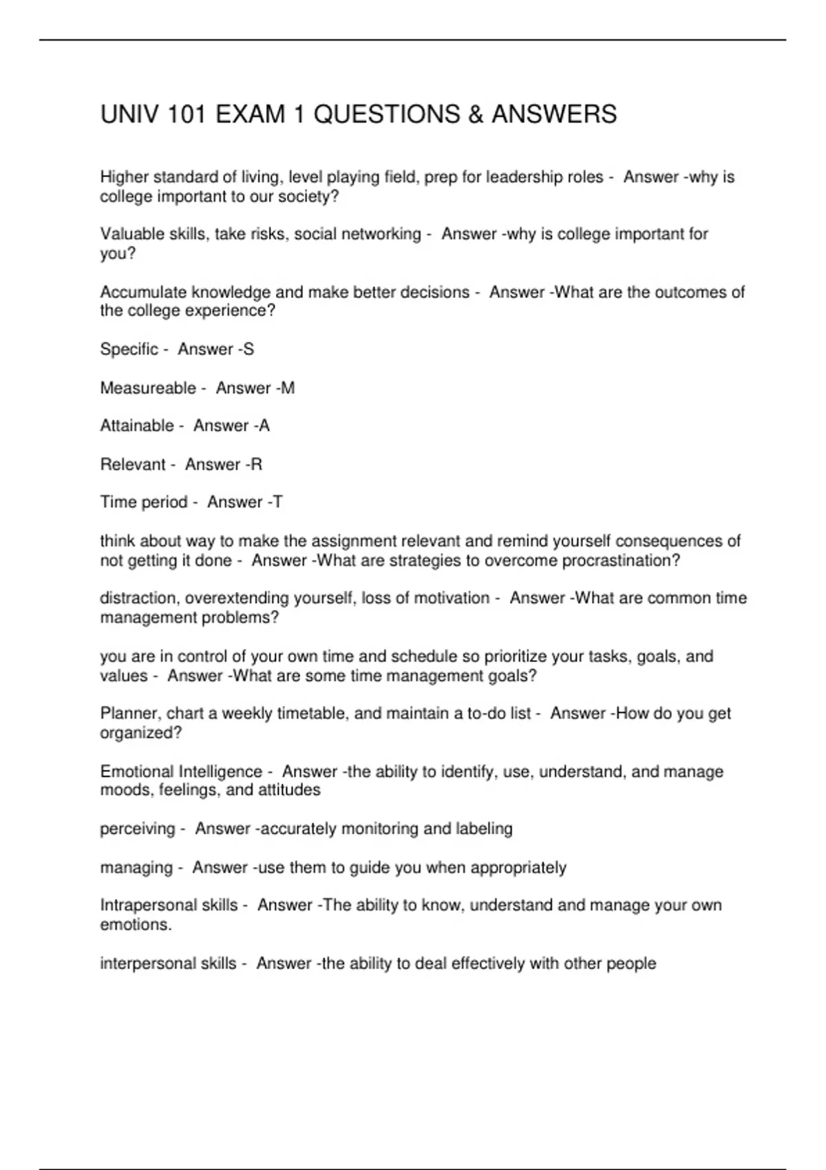 UNIV 101 EXAM 1 QUESTIONS & ANSWERS