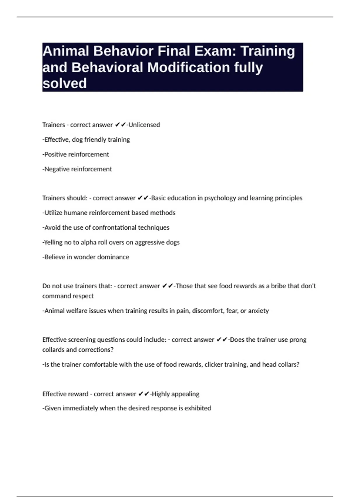 Animal Behavior Final Exam: Training and Behavioral Modification fully solved