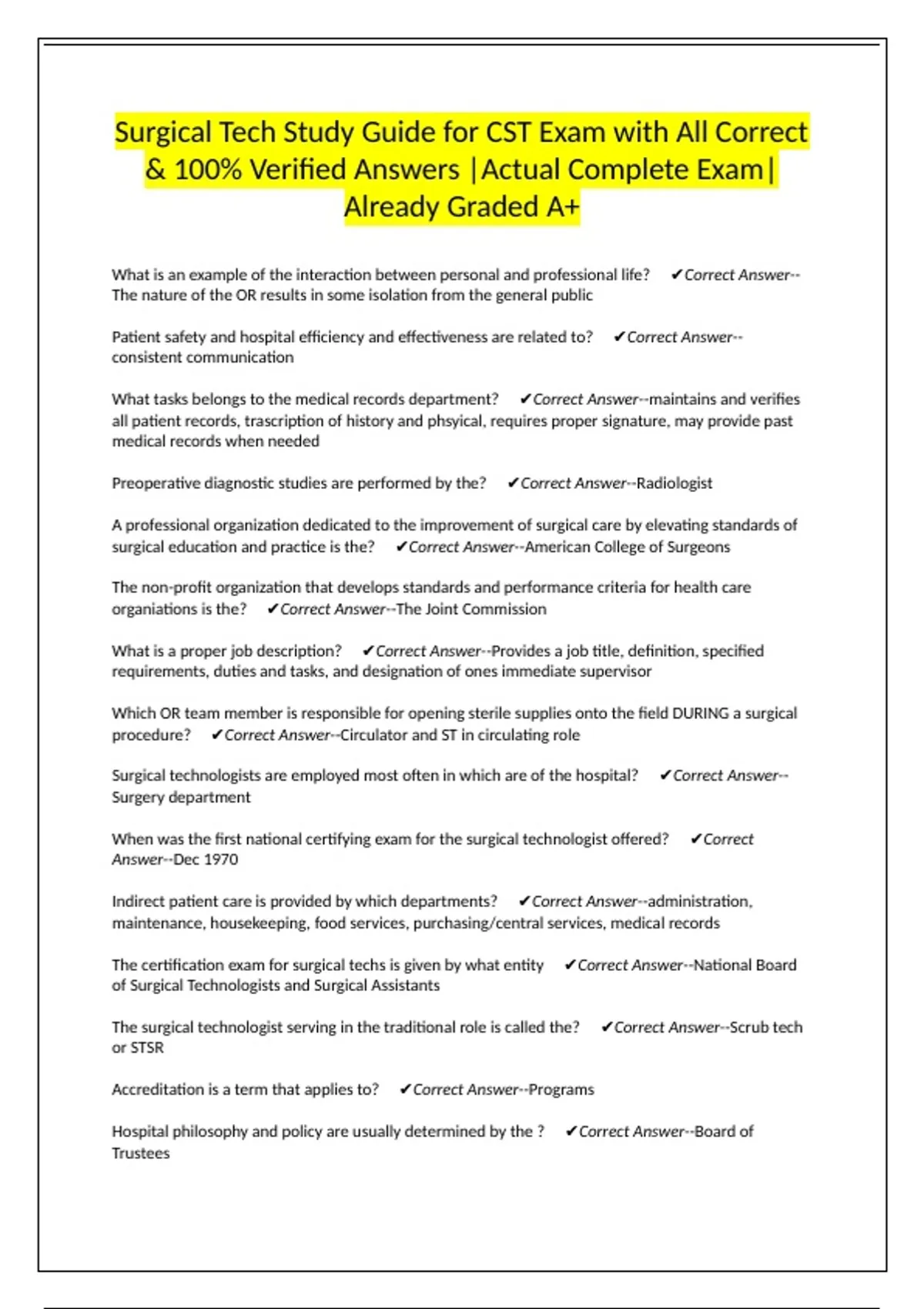 Surgical Tech Study Guide for CST Exam with All Correct & 100% Verified Answers |Actual Complete Exam| Already Graded A+