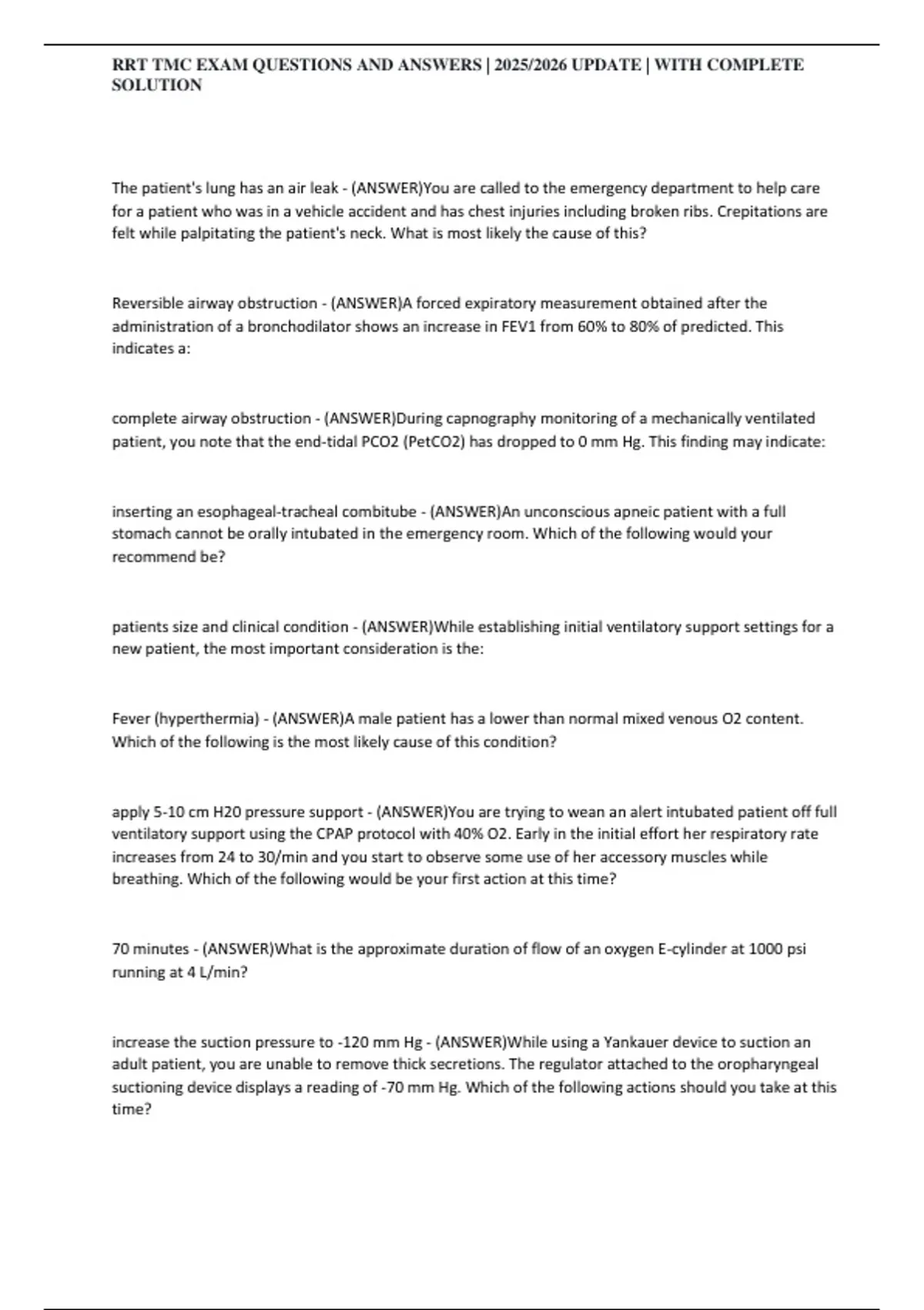,RRT TMC EXAM QUESTIONS AND ANSWERS | 2025/2026 UPDATE | WITH COMPLETE