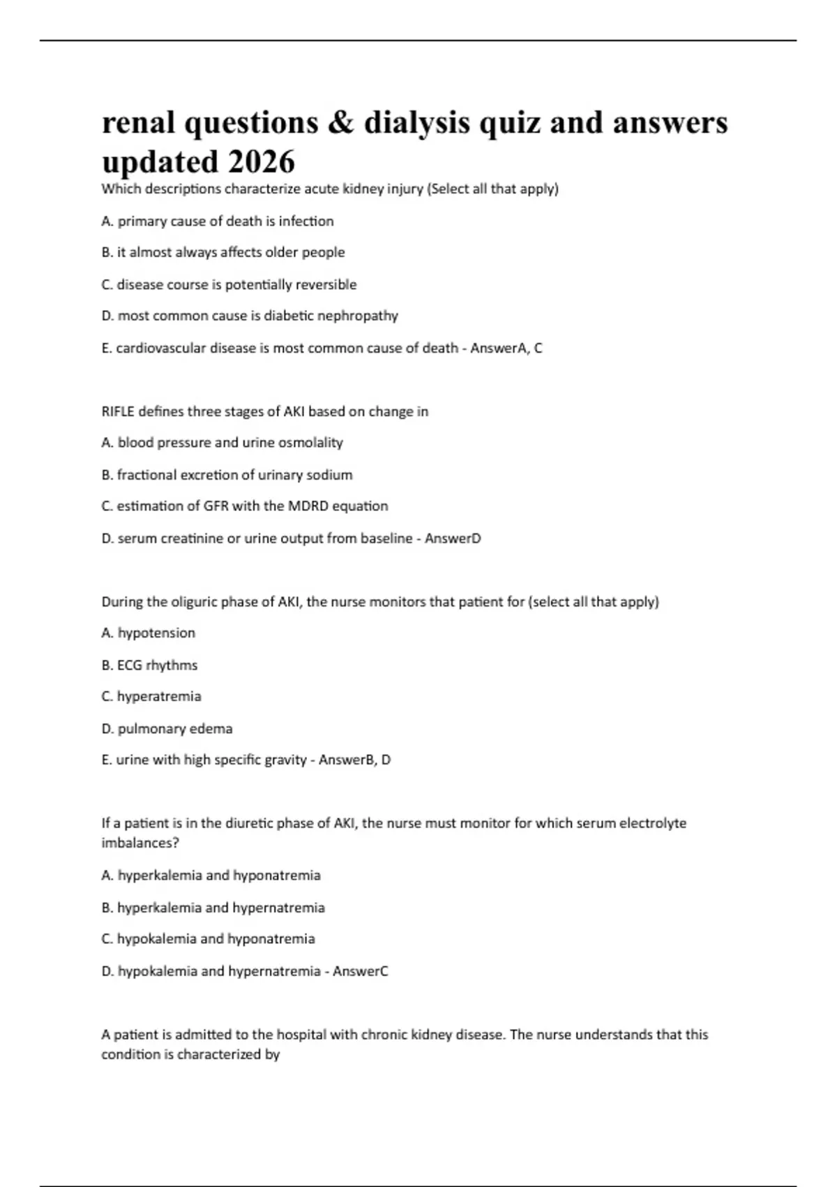 renal questions & dialysis quiz and answers