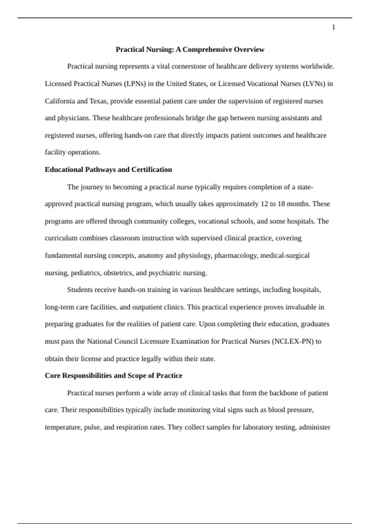 This document provides a comprehensive overview of practical nursing as a healthcare career. It covers the educational pathway, including the 12-18 month training programs and NCLEX-PN licensure exam. The piece details core responsibilities such as monitoring vital signs, administering medications, wound care, and patient support. It explores diverse work environments including hospitals, long-term care facilities, and home healthcare settings. The document addresses career advancement opportunities, particularly LPN-to-RN bridge programs, and discusses employment outlook driven by an aging population. It presents practical nursing as a rewarding, accessible entry point into healthcare that combines technical skills with compassionate patient care while offering stable employment and professional growth potential.
