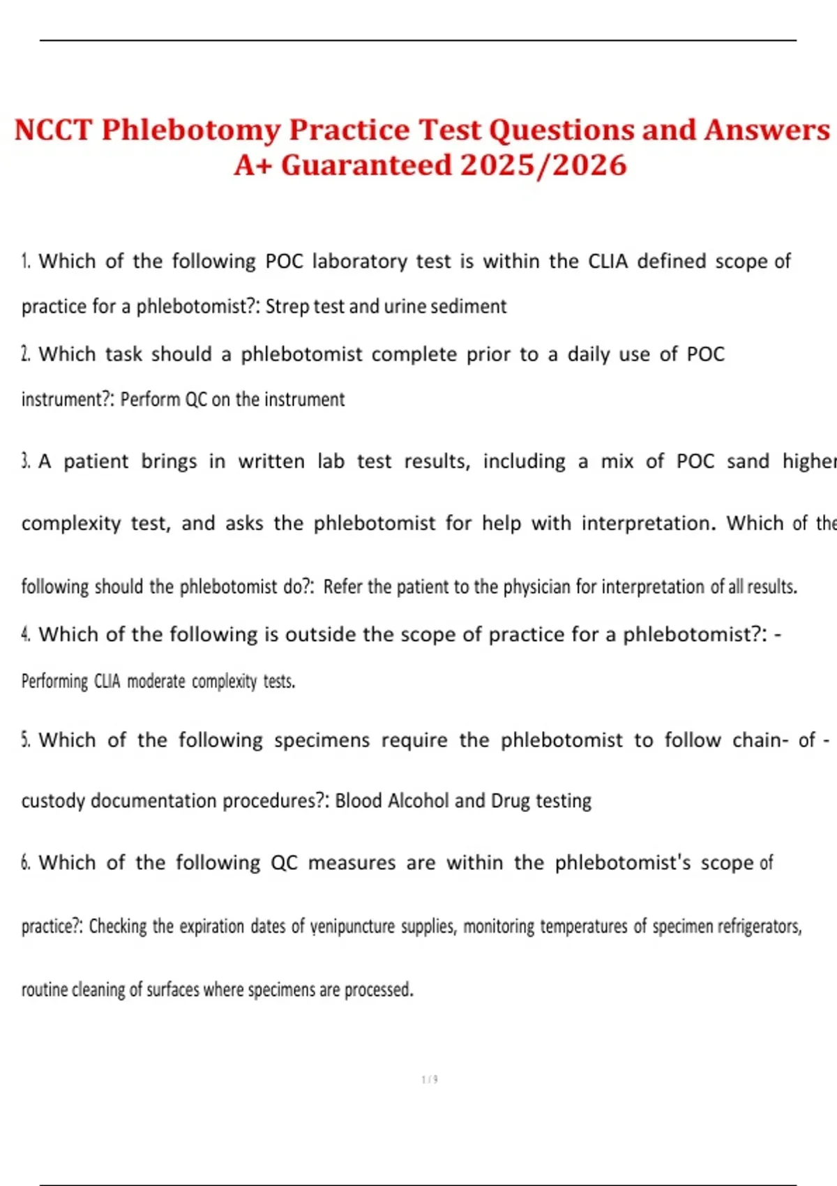 This document provides NCCT Phlebotomy practice test questions with correct answers designed for the 2025/2026 certification cycle. It supports thorough exam preparation by reviewing venipuncture procedures, patient safety, specimen collection, infection control, and exam-style questions commonly tested on the NCCT phlebotomy exam.