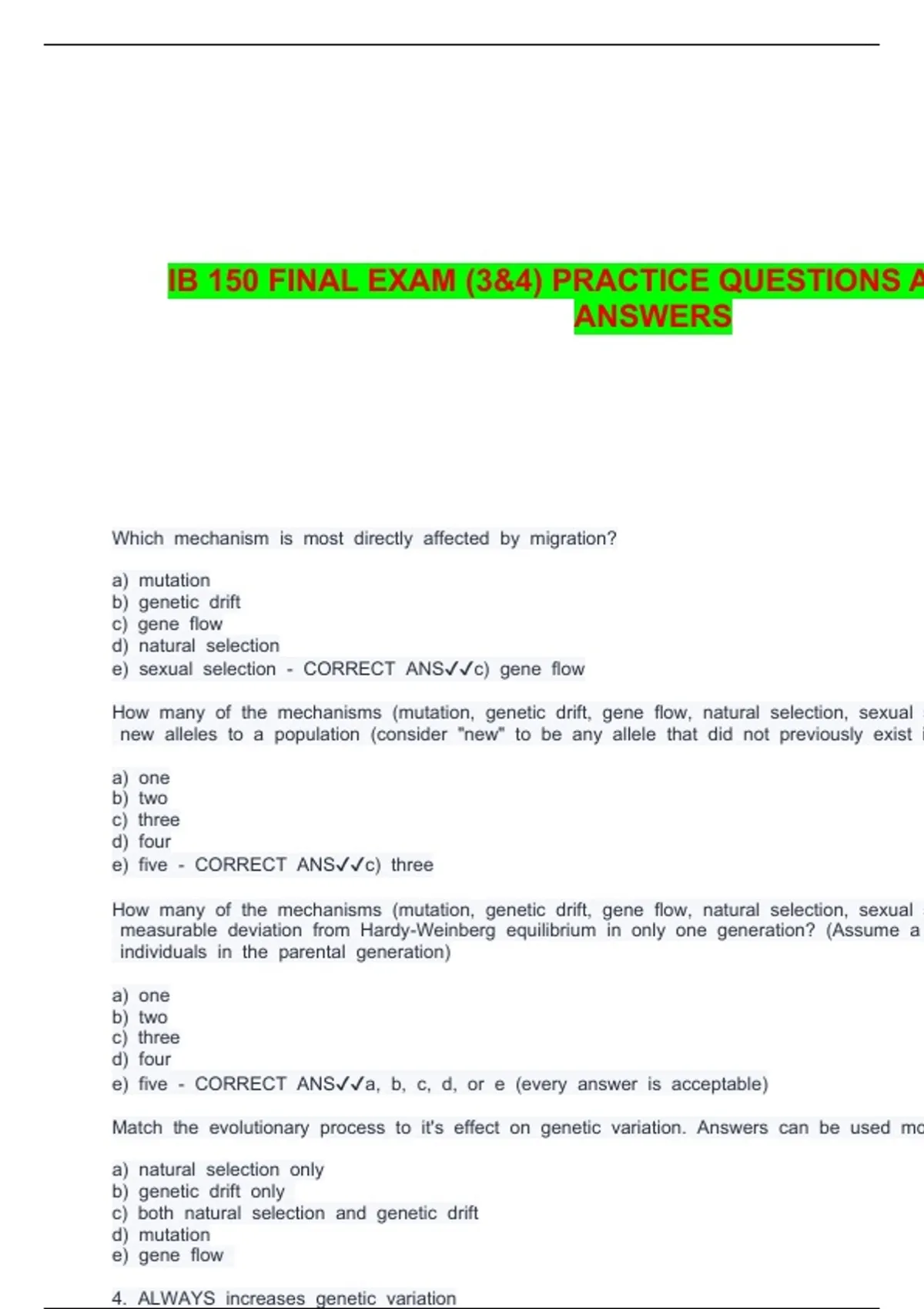 IB 150 FINAL EXAM (3&4) PRACTICE QUESTIONS A