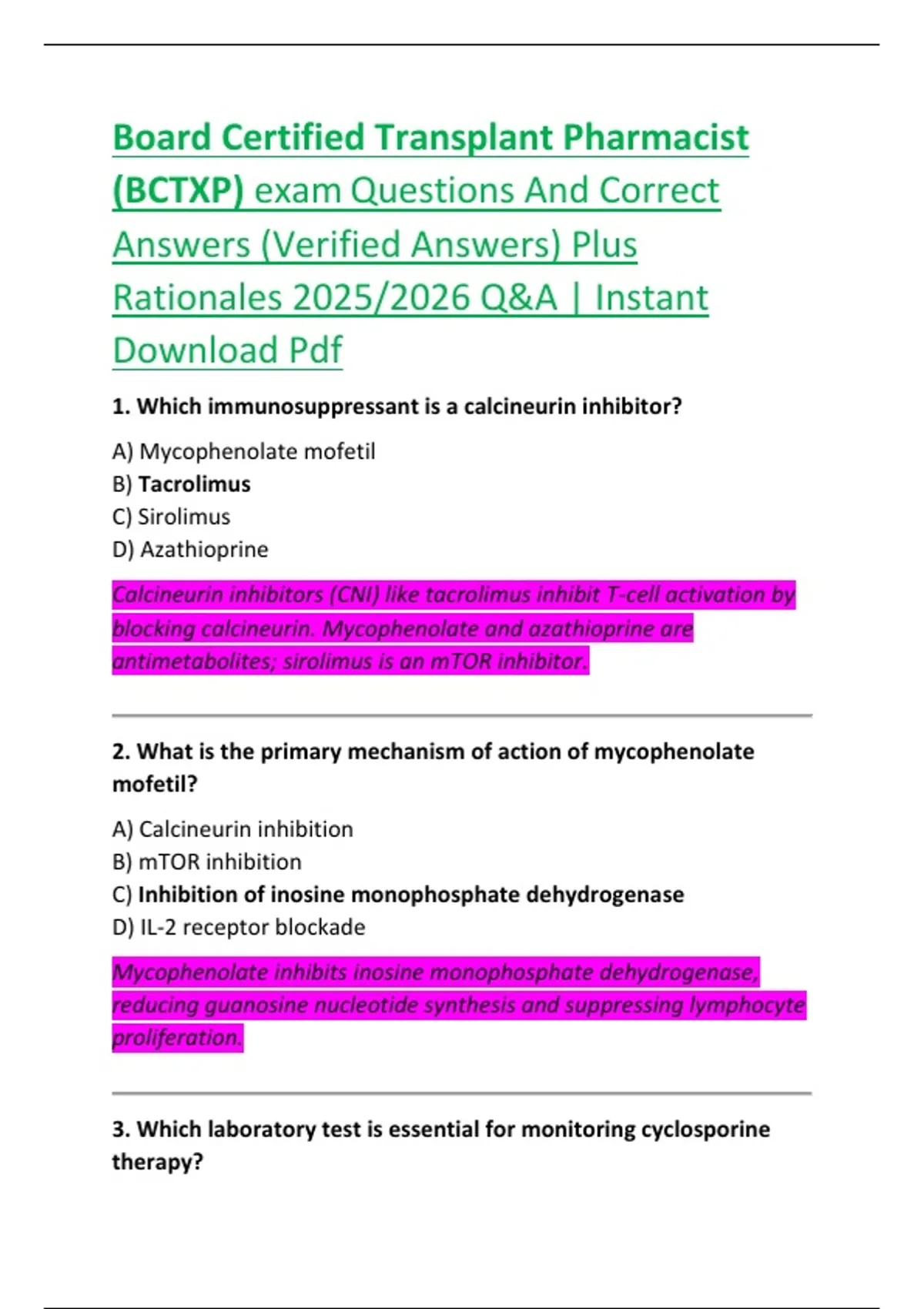 Board Certified Transplant Pharmacist (BCTXP) exam Questions And Correct Answers (Verified Answers) Plus Rationales 2025/2026 Q&A | Instant Download Pdf