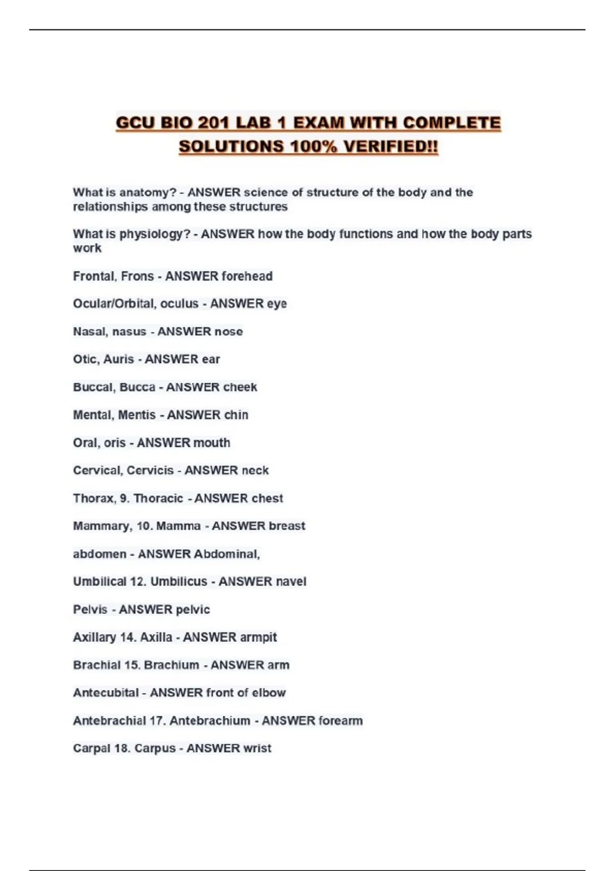 GCU BIO 201 LAB 1 EXAM WITH COMPLETE SOLUTIONS 100% VERIFIED!!...