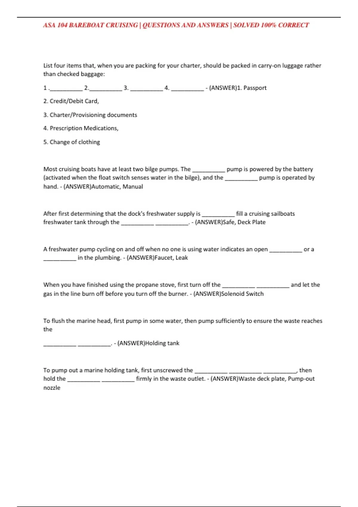 ASA 104 BAREBOAT CRUISING | QUESTIONS AND ANSWERS | SOLVED 100% CORRECT