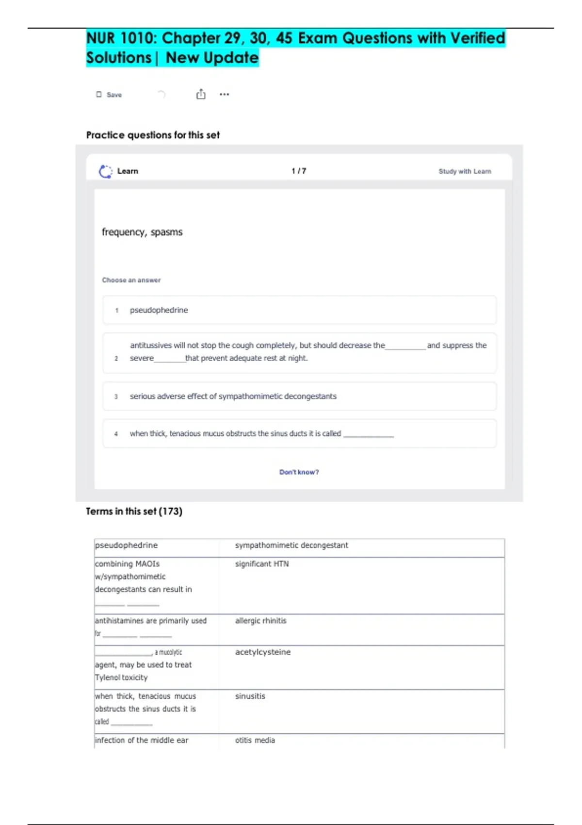 NUR 1010: Chapter 29, 30, 45 Exam Questions with Verified