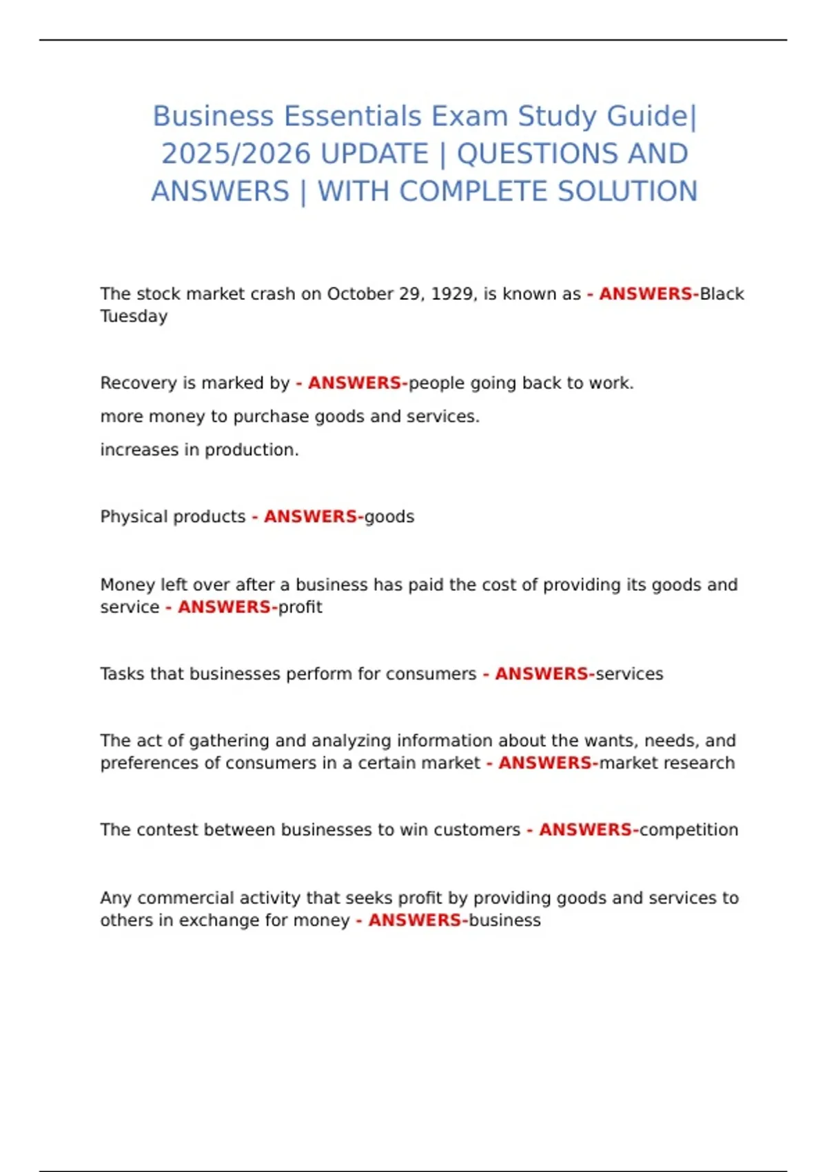 Business Essentials Exam Study Guide| 2025/2026 UPDATE | QUESTIONS AND ANSWERS | WITH COMPLETE SOLUTION