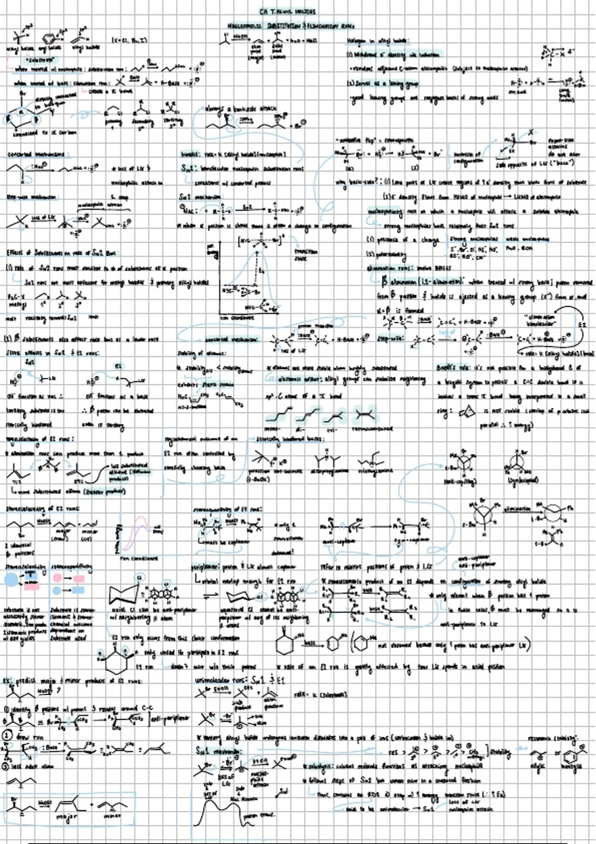 Review of Chapter 7 (Reactions of Alkyl Halides) in Organic Chemistry 1. Provides overview on nucleophilic substitution reactions (SN1, SN2) and elimination reactions (E1, E2). Introduces stereoselectivity, stereospecificity, and regioselectivity of substitution and elimination reactions. Differentiates between unimolecular and bimolecular reaction mechanisms, and step-wise versus concerted mechanisms. Discusses kinetics and thermodynamics of substitution and elimination reactions.