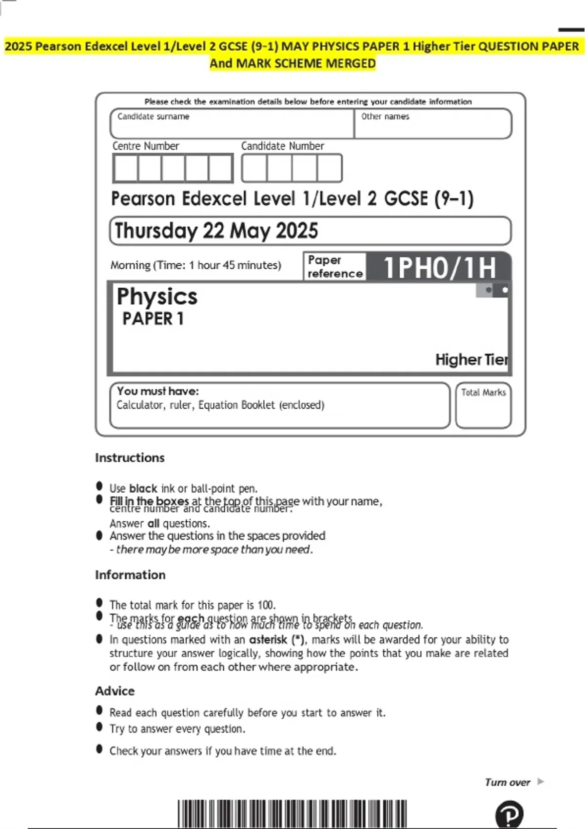 2025 Pearson Edexcel Level 1/Level 2 GCSE (9–1) MAY PHYSICS PAPER 1 Higher Tier QUESTION PAPER And MARK SCHEME MERGED