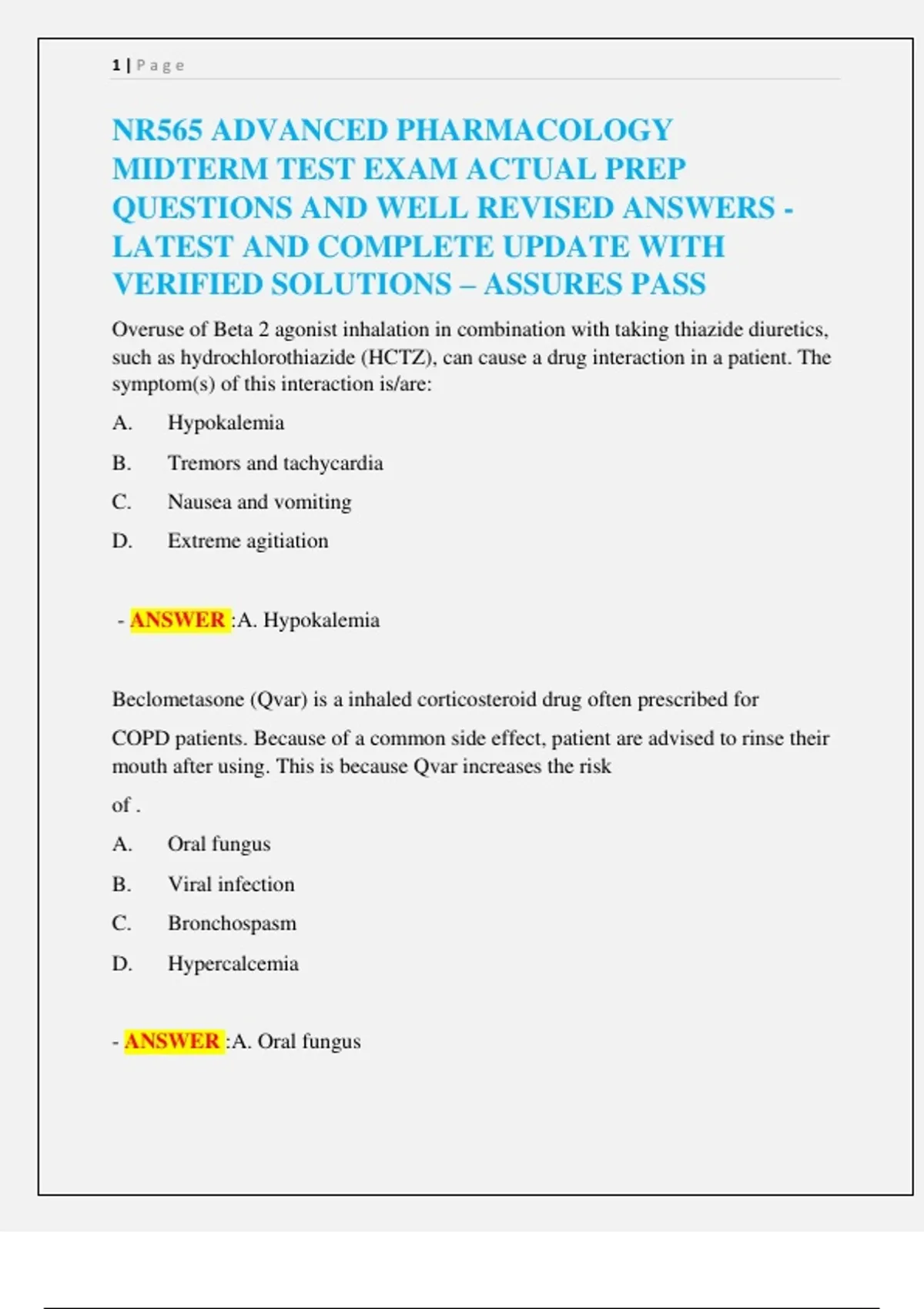 NR565 ADVANCED PHARMACOLOGY MIDTERM TEST EXAM ACTUAL PREP QUESTIONS AND WELL REVISED ANSWERS - LATEST AND COMPLETE UPDATE WITH VERIFIED SOLUTIONS – ASSURES PASS